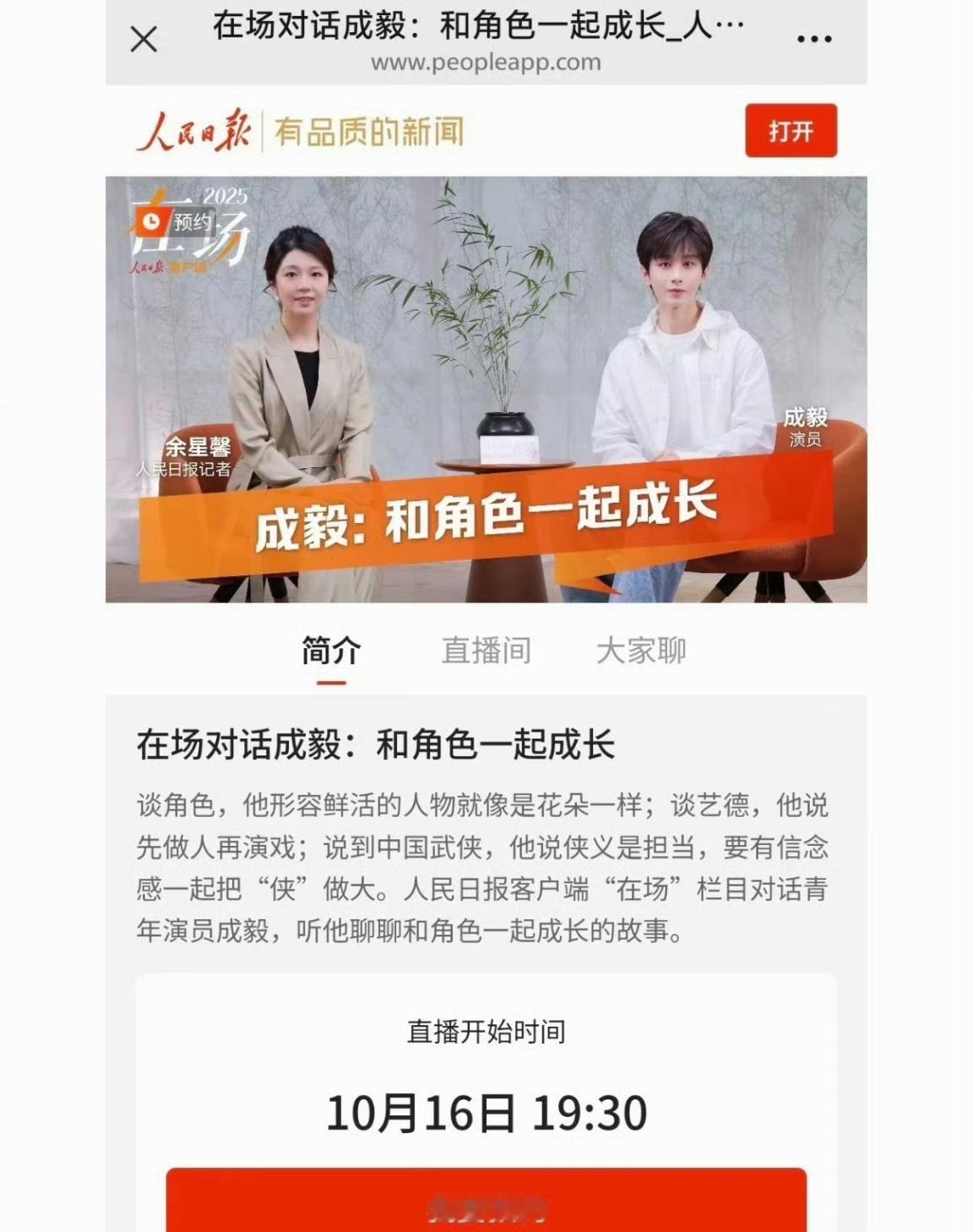 成毅明晚19:30分接受人民日报直播专访,现场对话成毅:“和角色一起成长!