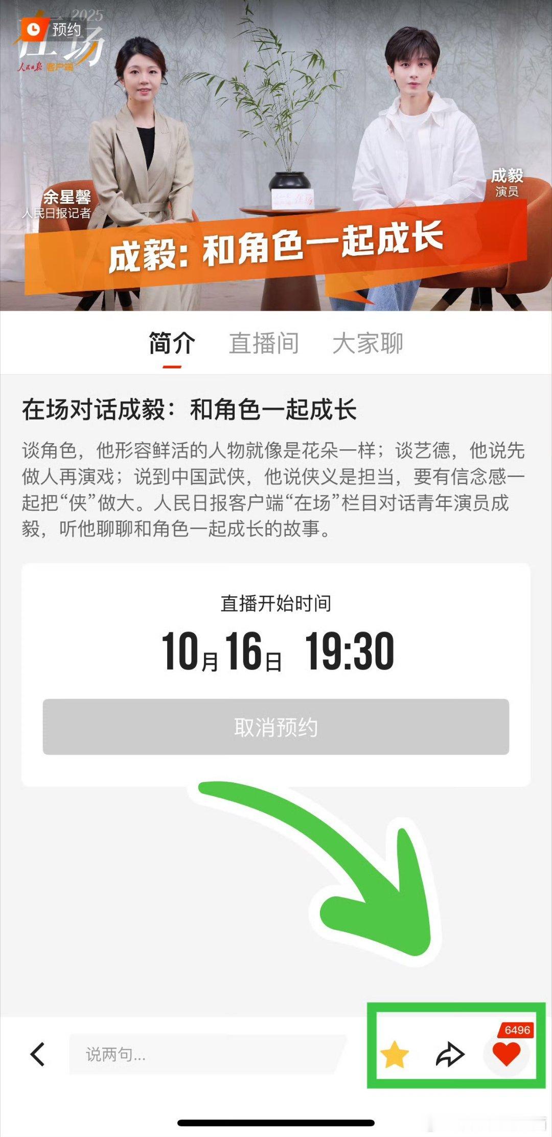 明天晚上1️⃣9️⃣:3️⃣0️⃣,成毅人民日报专访直播可以预约啦