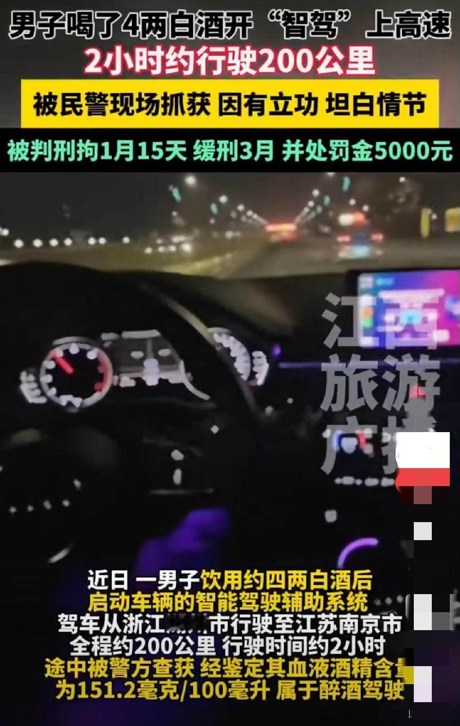 喝4两白酒敢开“智驾”跑高速? 这哥们胆也太肥了!南京这起案子真让人惊掉下巴,王某喝了酒凌晨开着带辅助驾驶的车,从湖州一路飙到南京,俩小时干了200公里,被交警拦下时血醇都151.2mg/100ml了,妥妥的醉驾。 现在总有人觉得“智驾”就是“自动驾驶”,喝了酒也敢撒手,湖南益阳、杭州都出过类似事,有躺着副驾睡觉的,有让车自己跑的,真是拿命开玩笑。要我说,这些人根本没搞懂,现在的“智驾”顶多算个“副驾帮手”,真把方向盘全交出去,出了事哭都来不及。 王某最后判了缓刑,但这事儿给所有人提了个醒:别迷信所谓的“智驾”,酒后不管开啥车、用啥辅助功能,都是在违法玩命。你们说,要是真遇到有人酒后开“智驾”上路,咱该咋第一时间提醒或举报呢?