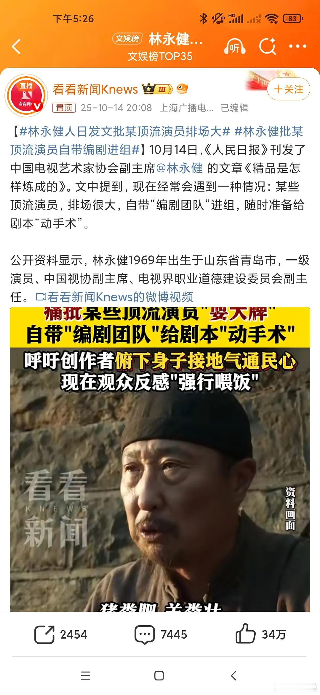 林永健曝光某顶流明星带编剧进组,这说的到底是谁林永健人日发文批某顶流演员排场大