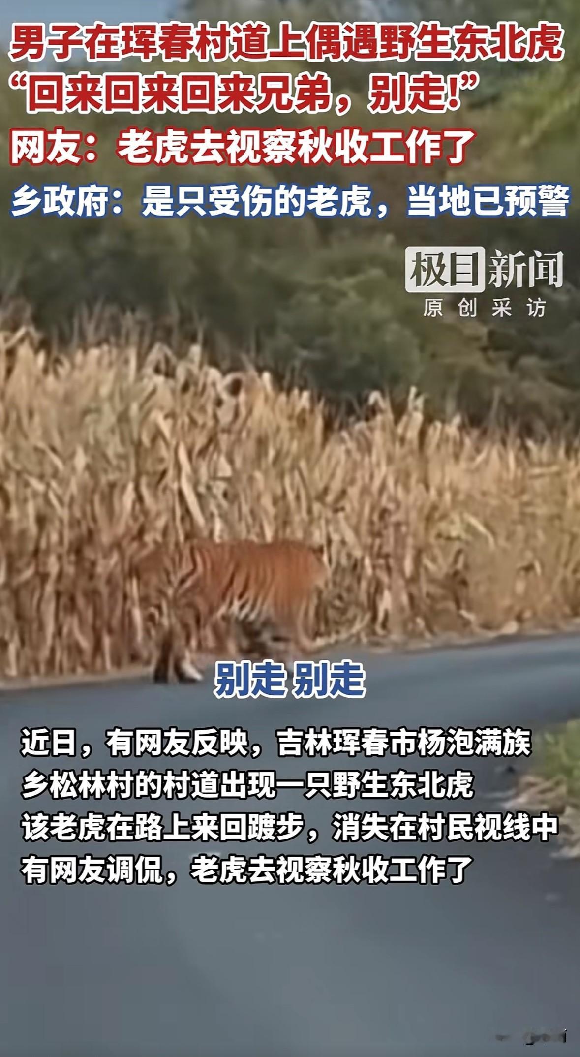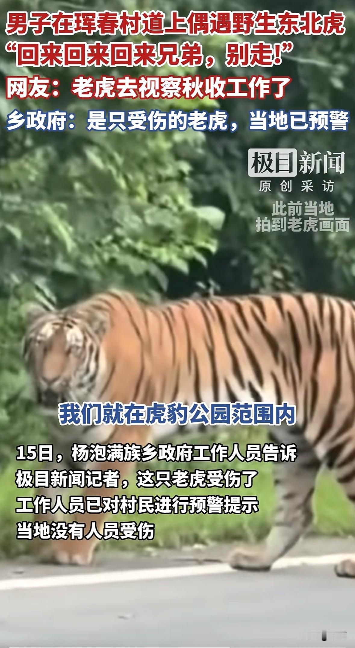 10月14日下午,吉林珲春杨泡满族乡松林村一男子驾车时,在村道发现后方有只野生东北虎,还拍了视频。视频里老虎来回踱步,听到喊话停步后走向远处。 乡政府说这老虎受了伤,已经给村民发了预警,村口和村道也设了标识,目前没人受伤。这里属于东北虎豹国家公园,常见虎豹。 这事能看出生态保护见效了,虎豹活动变多。但得提醒下,遇到野生东北虎可不能随便打招呼,受伤的虎可能更具攻击性。正确做法是保持冷静,别跑,慢慢后退远离,赶紧联系相关部门,安全第一。拍摄也得保持安全距离,别干扰动物。