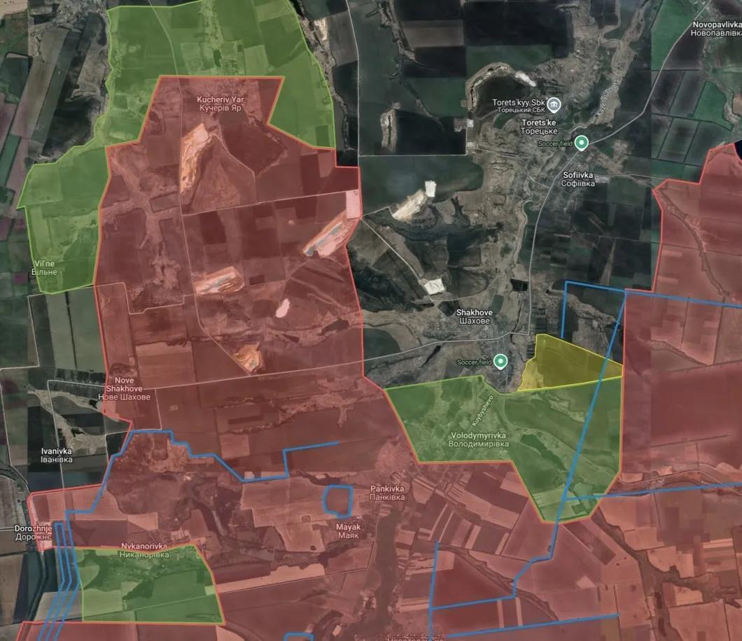 俄军中部集群在红军城以北突出部进一步变壮,绿色区域是稍早前俄军占领的,黄色区域是