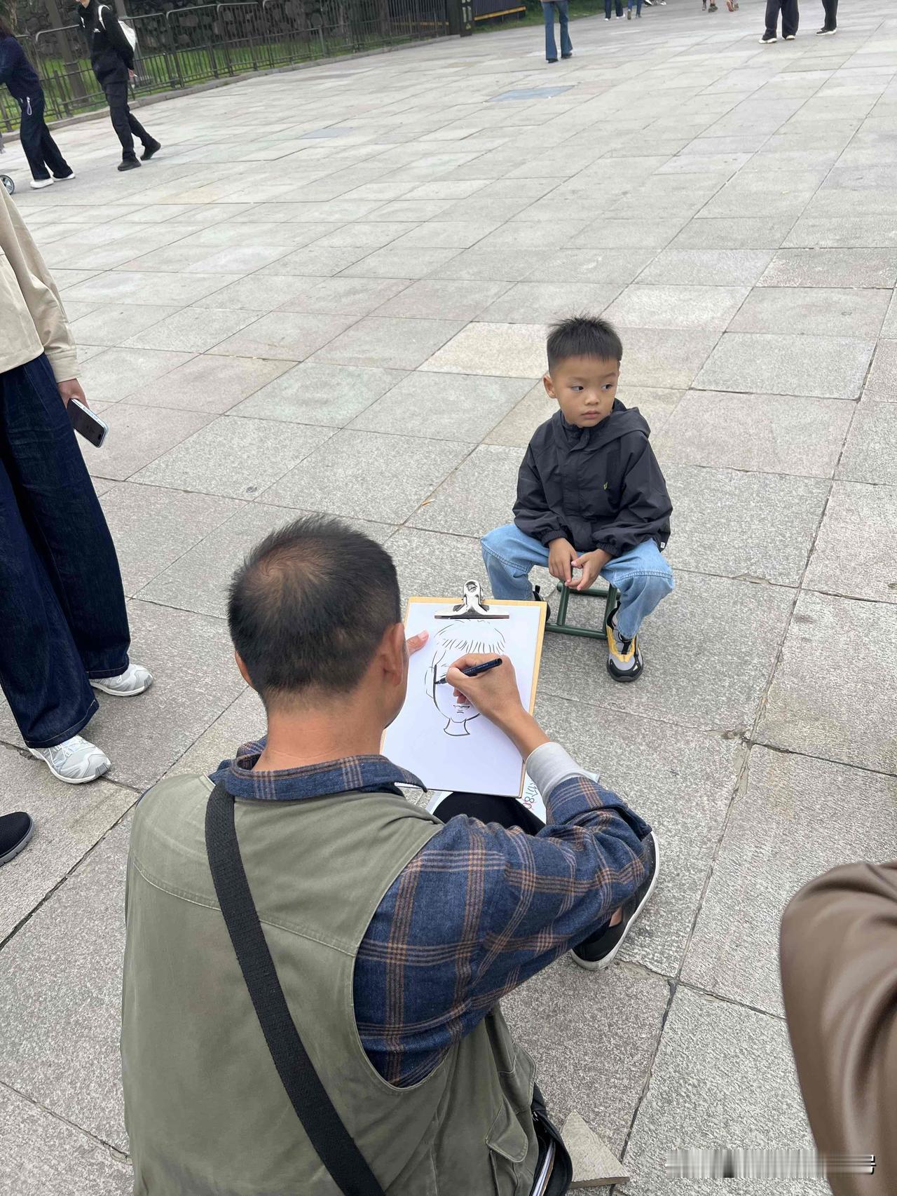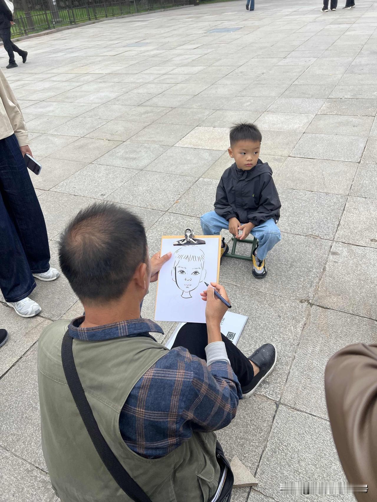 昨天路过大雁塔,看到这个画肖像的师傅在给一个小朋友画画,围观了很多人在看,我也凑