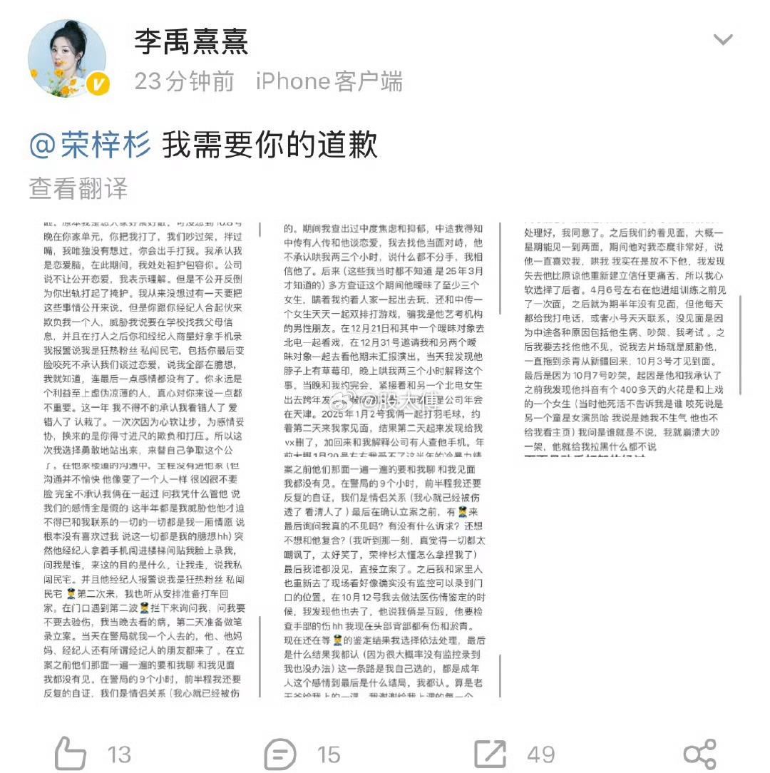 李禹熹称荣梓杉出轨打人感情纠纷可以慢慢掰扯,但“拎起摔到地上”“踹了一脚”这种暴