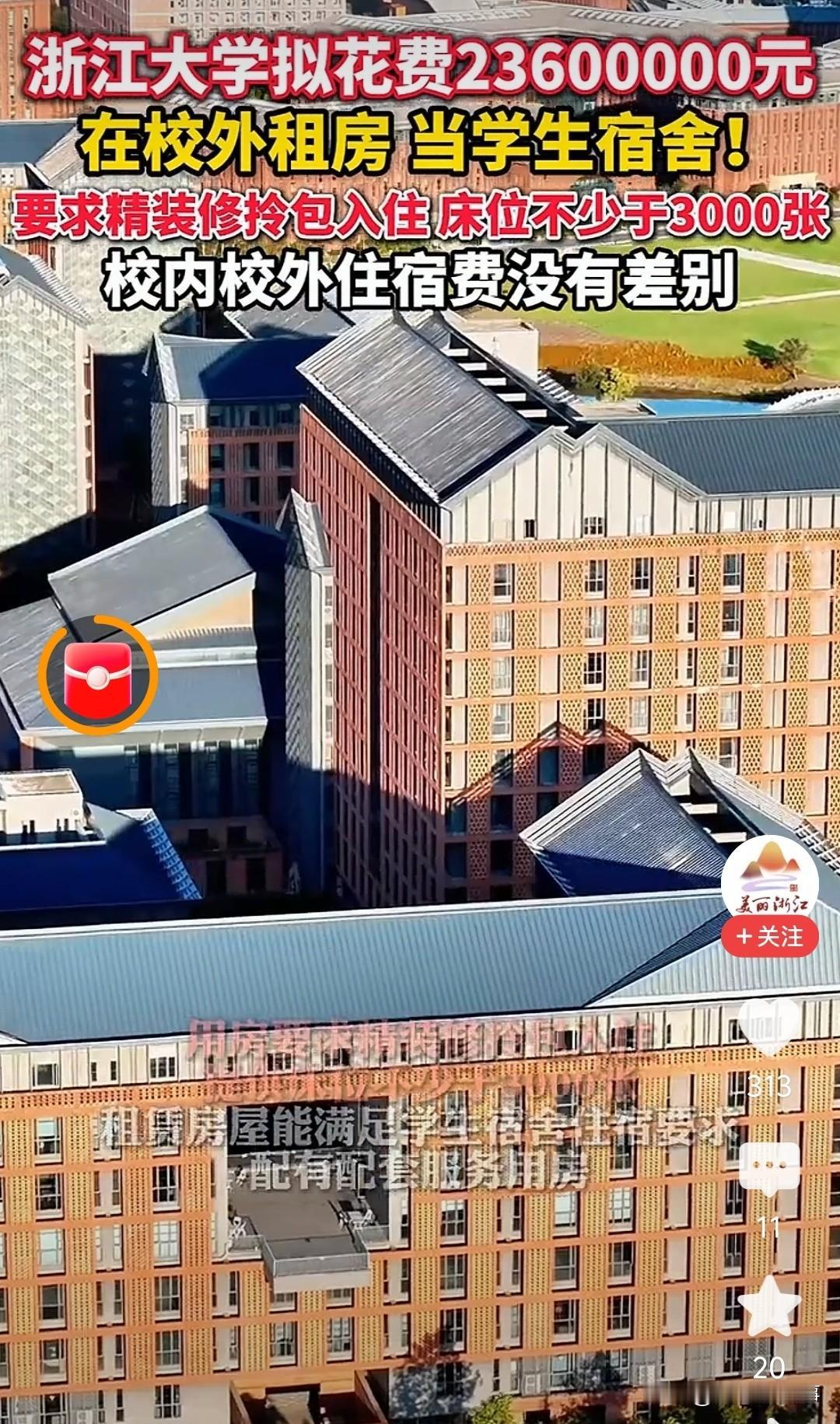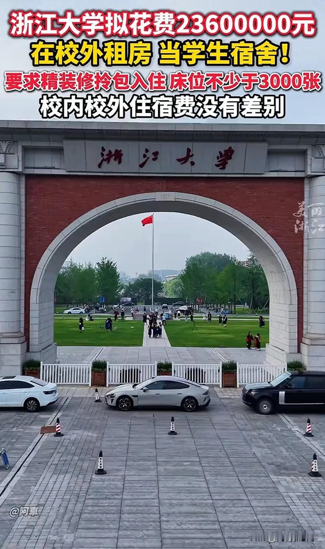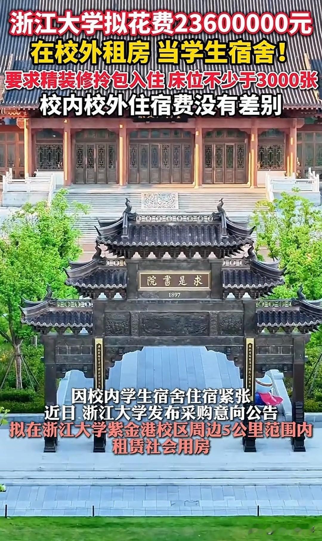 浙大拟用2360万租房当学生宿舍 浙大拟斥资2360万租房当学生宿舍这事挺引人关注。因为研究生招生规模扩大,校内专硕宿舍不够用了,所以打算在紫金港校区周边5公里内租精装修且能拎包入住的社会用房,提供超3000张床位,还有配套服务用房。 2026级全日制专硕,第一学年学校帮忙租校外房,后续得自己解决,学校会适当补贴。不过学校说不管住校内校外,住宿费都一样。这做法也是无奈之举,研究生越来越多,学校宿舍资源有限,希望能真帮学生解决住宿难题,就看后续落实得咋样了。