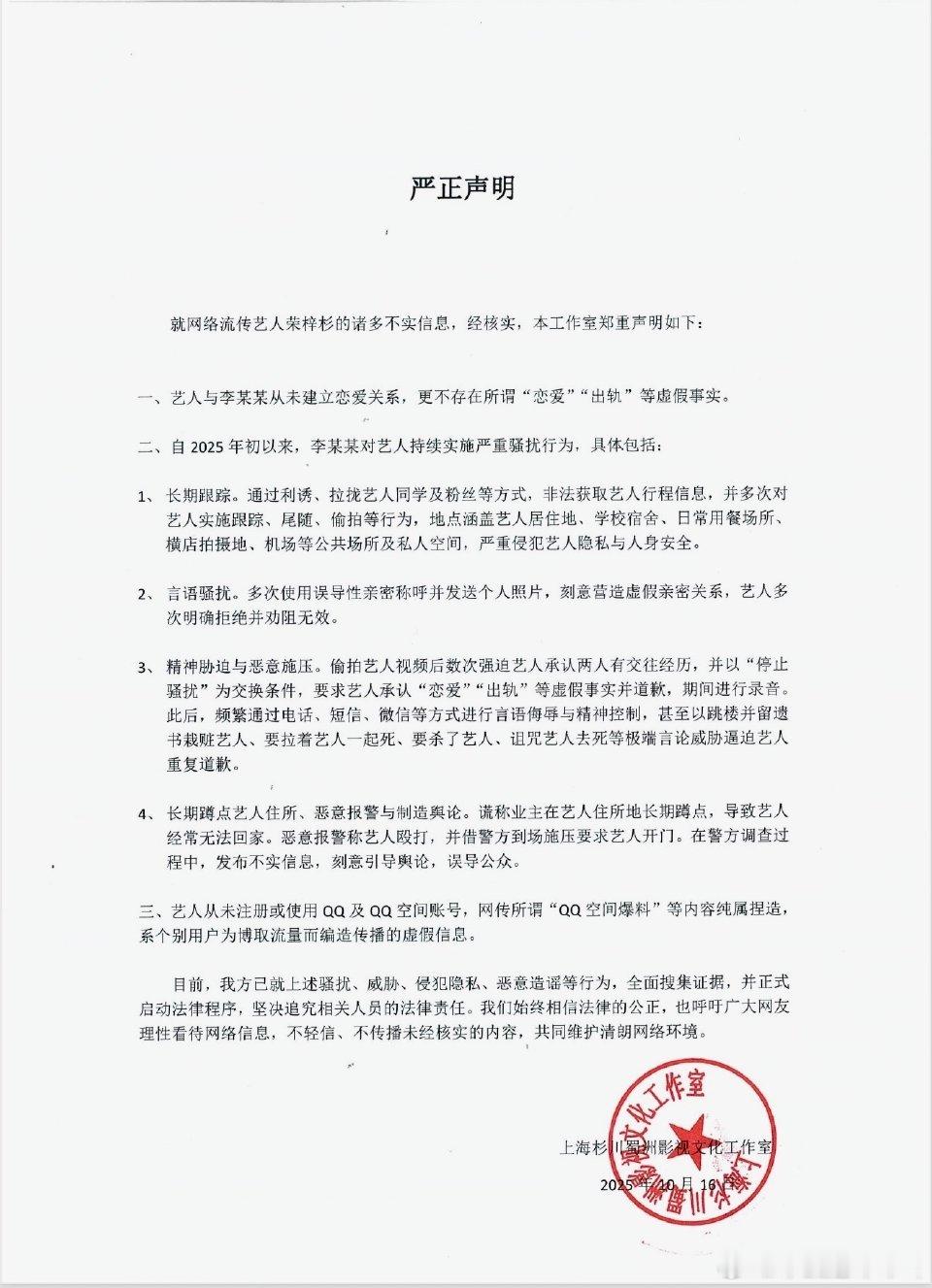 荣梓杉 工作室发声明了 说被长期跟踪了