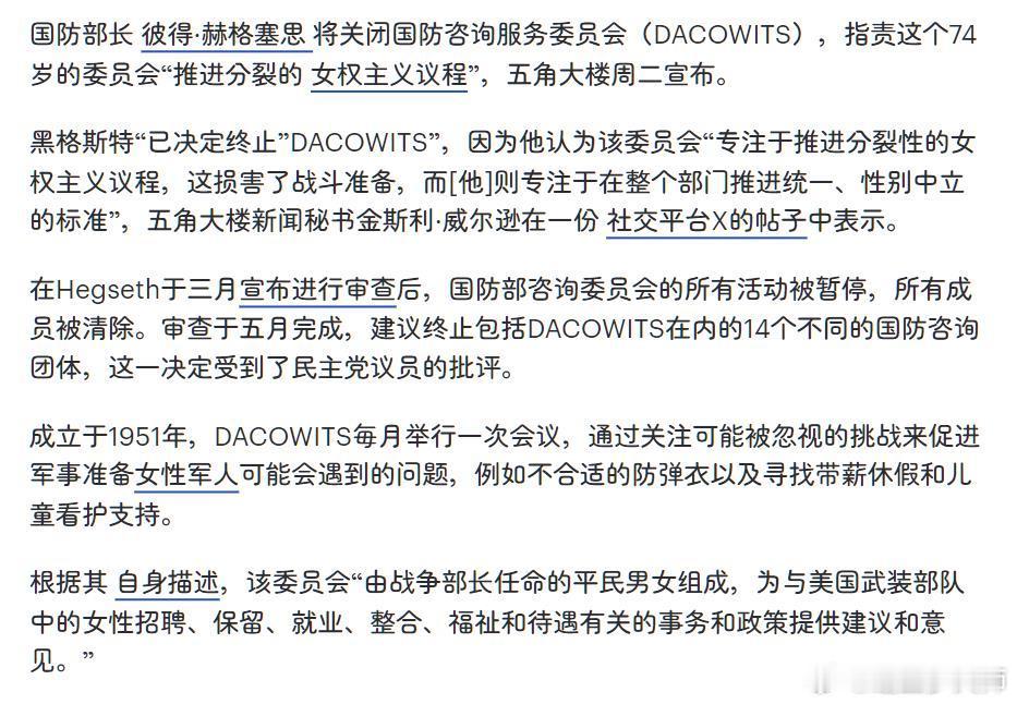 美国防长撤销了“国防妇女顾问委员会”(Defense Advisory Committee on Women in the Services, DACOWITS)。