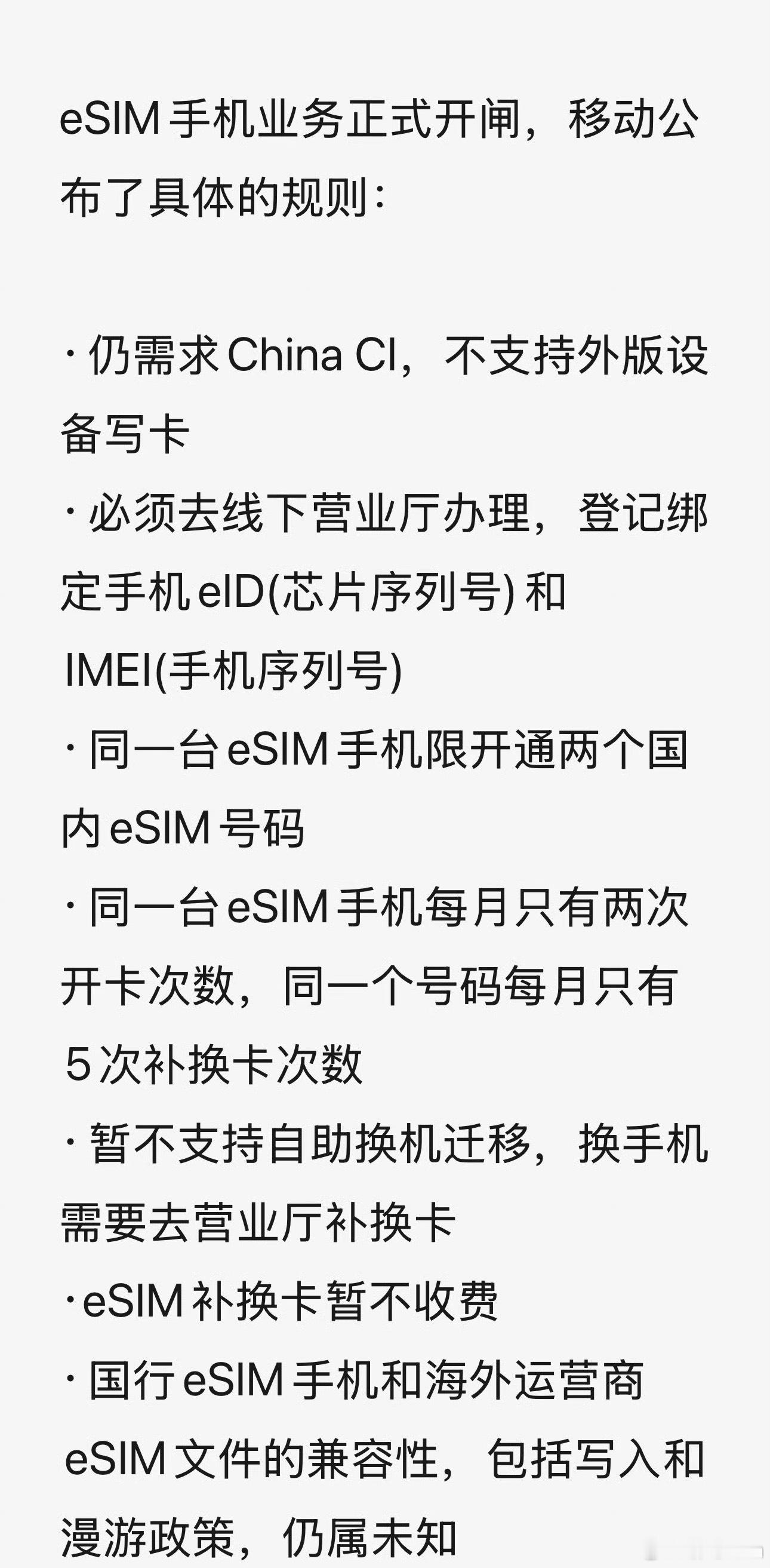 esim可以单独搞一个账号啊,比如自己手机号跟密码,只要在新机登录输入密码就能迁移,或者实在不行绑定自己人脸信息,换手机你在新手机输入账号密码就可以迁移,有些人总是说电信诈骗拔不了卡,事实上你那点钱也没人诈骗,而且真诈骗你也需要拔卡针,除了在家里面有针,你其他情况也没法随意拔针,esim只是起步,运营商确实搞的太复杂了,直接输入账号密码线上注册直接复制后或者用NFC复制实体卡不好吗?非要办理换机去线下,反正我是支持的,因为我是29块钱无限流量不限速不限量绝版卡,万一实体卡坏了他不给办因为没套餐,esim我就可以永久使用