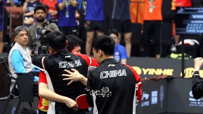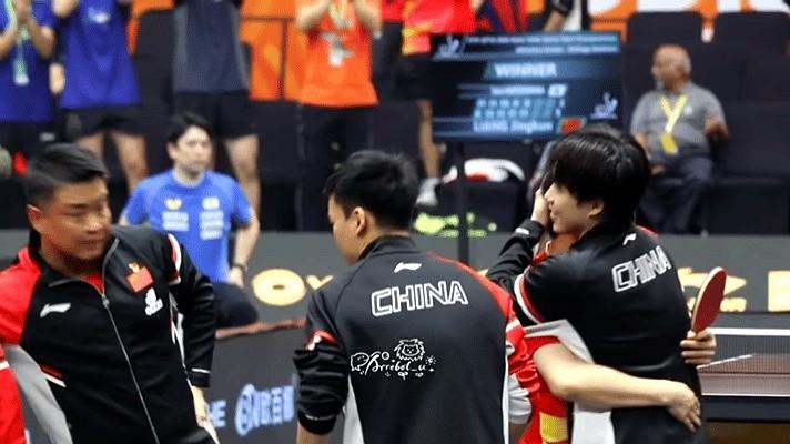 梁靖崑赢下比赛,大喊着跑向中国乒乓球队,和王皓拥抱,和王楚钦紧紧拥抱。 亚锦赛男