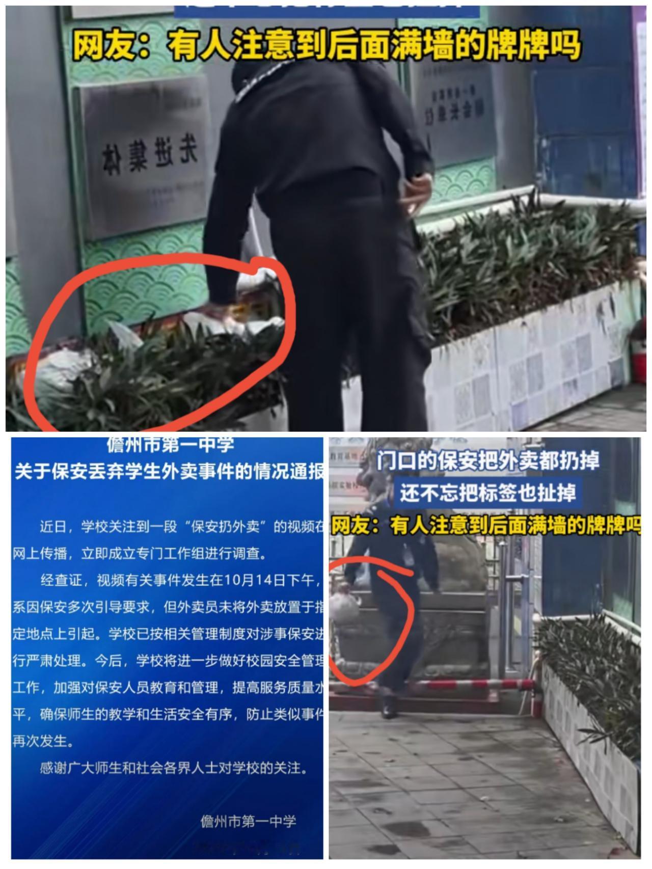 那个学校门口保安扔外卖并撕掉标签,海南省儋州市第一中学发了通报,细看内容并不能服众。 通报中说是外卖员多次没按保安的指引,把外卖放在指定的地方,继而保安做出了那番举动。 思考一下,一个保安工资2千,他再有责任心充其量就是把外卖扔掉,撕标签完全是多余的动作。 为啥,是不让学生找到自己的外卖然后和外卖员起纠缠?要是这样,这个保安就坏透了,而校方不会单单严肃处理这么简单,解聘还差不多。 应该还是保安得到了上级的指示才敢这样,也是为了保住自己饭碗,谁授的意,懂得都懂,拿着2千的工资背着2万的锅,这年头保安也不好做啊! 校园外卖禁令 学校为食品安全扔外卖合理吗