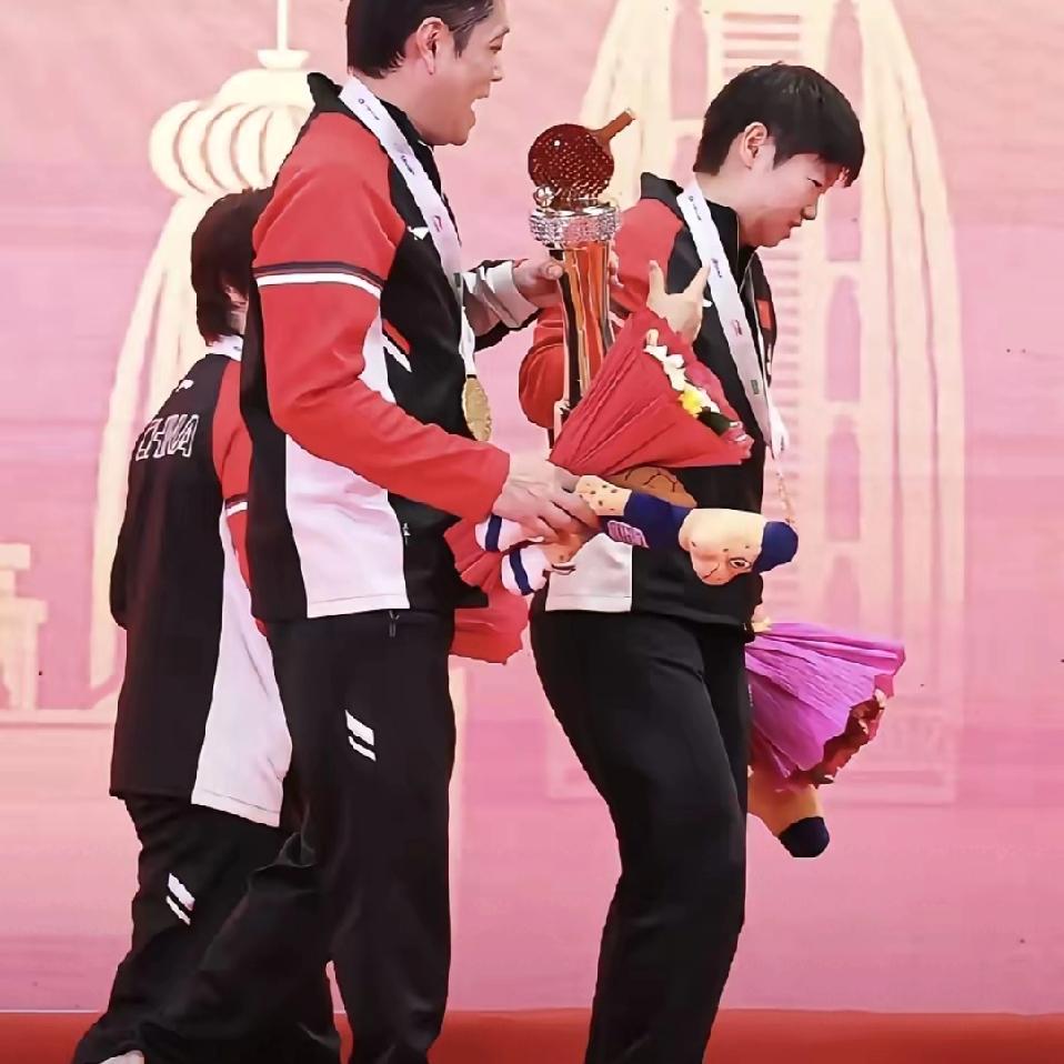 刚走下领奖台,莎莎就把奖杯往Coco手里塞:“拿不了拿不了,Coco爹快接着!都说我不拿了,非让我拿,现在该你了!” Coco笑着接过来,特开心。这么多年莎莎只负责赢奖杯,拿杯举杯从不管。这师徒俩真逗,又把莎莎给逗得一脸“皱巴巴”的!