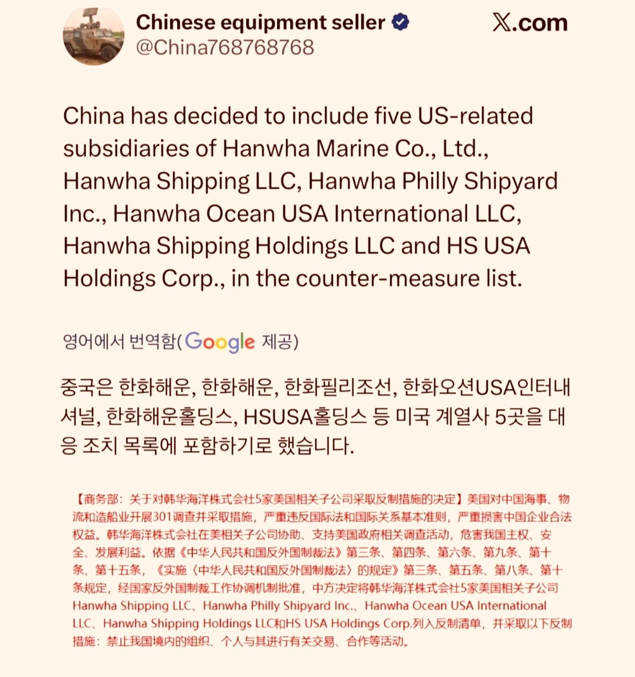 当头警告!韩国充当“马前卒”没有好下场,中方一记杀鸡儆猴干得漂亮! 中方宣布对韩华海洋等5家在美子公司实施限制——被美国捶一顿,再被中国捶一顿——这就是走钢丝的下场!活该两头挨揍!世界级受气包韩国,接下来就只剩国家破产这一条路了。 韩华正受到中国的制裁,现代正受到美国的制裁。韩网友质疑政府到底在干什么?什么问题都没解决,让国家变得一团糕!