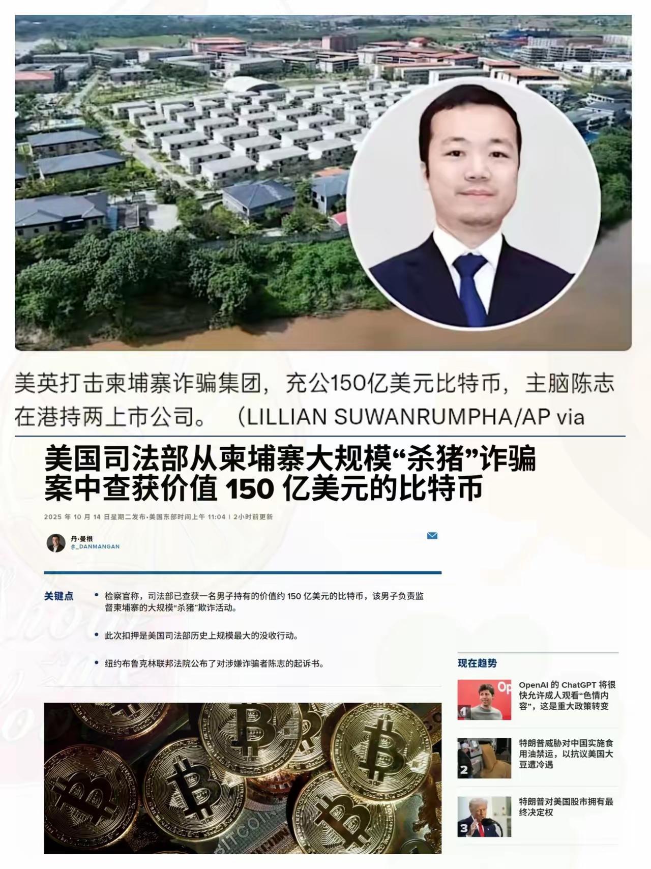 美国这波操作够狠! 柬埔寨太子集团的诈骗园区被盯上,头目陈志遭通缉,150亿美元比特币直接被没收,堪称史上最大规模资产收缴 。 要知道,中柬早就联手打击电诈,六国联合行动更是抓了7万多人。美国出手本质是因自身一年被骗超100亿美元,完全是针对性自保 。打击跨国犯罪从不是单打独斗,而是各国按需发力的协作。 这哪是简单的“出手”,简直是精准的“抄家”。美国司法部10月14日启封的起诉书里说得明明白白,38岁的福建籍头目陈志,靠着英国和柬埔寨双重国籍,在柬埔寨建了至少十个“诈骗监狱”——高墙铁丝网围着,把被骗来的人当奴隶,用暴力逼着他们搞“杀猪盘”。光两个窝点就有1250部手机,操控7.6万个社交账号,专挑全球受害者下套,骗来的钱全用比特币洗白。 150亿美元可不是小数目,折成人民币得1069亿,全是从受害者口袋里榨出来的血汗钱。陈志拿着这些脏钱买私人飞机、名贵手表,还从纽约拍卖行拍了毕加索的画,在伦敦囤了19处房产,其中一栋市中心办公楼就值近1亿英镑。这架势哪像个商人,分明是把犯罪当生意做,还做成了“柬埔寨公爵”,甚至当上前首相的顾问,表面光鲜得能骗过不少人。 美国这次动真格,根本不是突然仗义。2024年一年,美国人被东南亚电诈骗走超100亿美元,不少老人的养老金都被骗光了。之前中柬联手、六国联动抓了7万多人,打垮了不少针对中国受害者的园区,这些诈骗集团转头就把目标对准了美国,甚至靠星链设备重建网络专门骗美国人。自家民众的钱袋子被掏得太狠,美国司法部才撕破脸,搞出这场史上最大规模的资产没收,说白了就是自保刚需。 更有意思的是,这次是美英联手动手。美国冻比特币,英国冻房产,连柬埔寨西港的金贝集团这些“同伙”也被拉进制裁名单。要知道,这些诈骗园区能活这么久,早跟当地的灰色利益链绑在了一起,光靠一国之力很难连根拔起。中柬之前的联合行动端掉不少窝点,现在美国补上金融打击的一环,正好掐住了犯罪集团“洗钱享乐”的命门。 不过陈志至今还在逃,下落不明。这也暴露了跨国犯罪的棘手之处:头目躲在法律盲区,资金藏在加密货币里,园区换个地方又能开张。但这次美英的行动也算给所有诈骗集团提了个醒——不管披着多少合法外衣,不管把钱洗得多干净,只要动了各国的核心利益,迟早会被联手清算。所谓的“协作”,从来不是喊口号,而是你端窝点我冻资产,谁都别想当漏网之鱼。