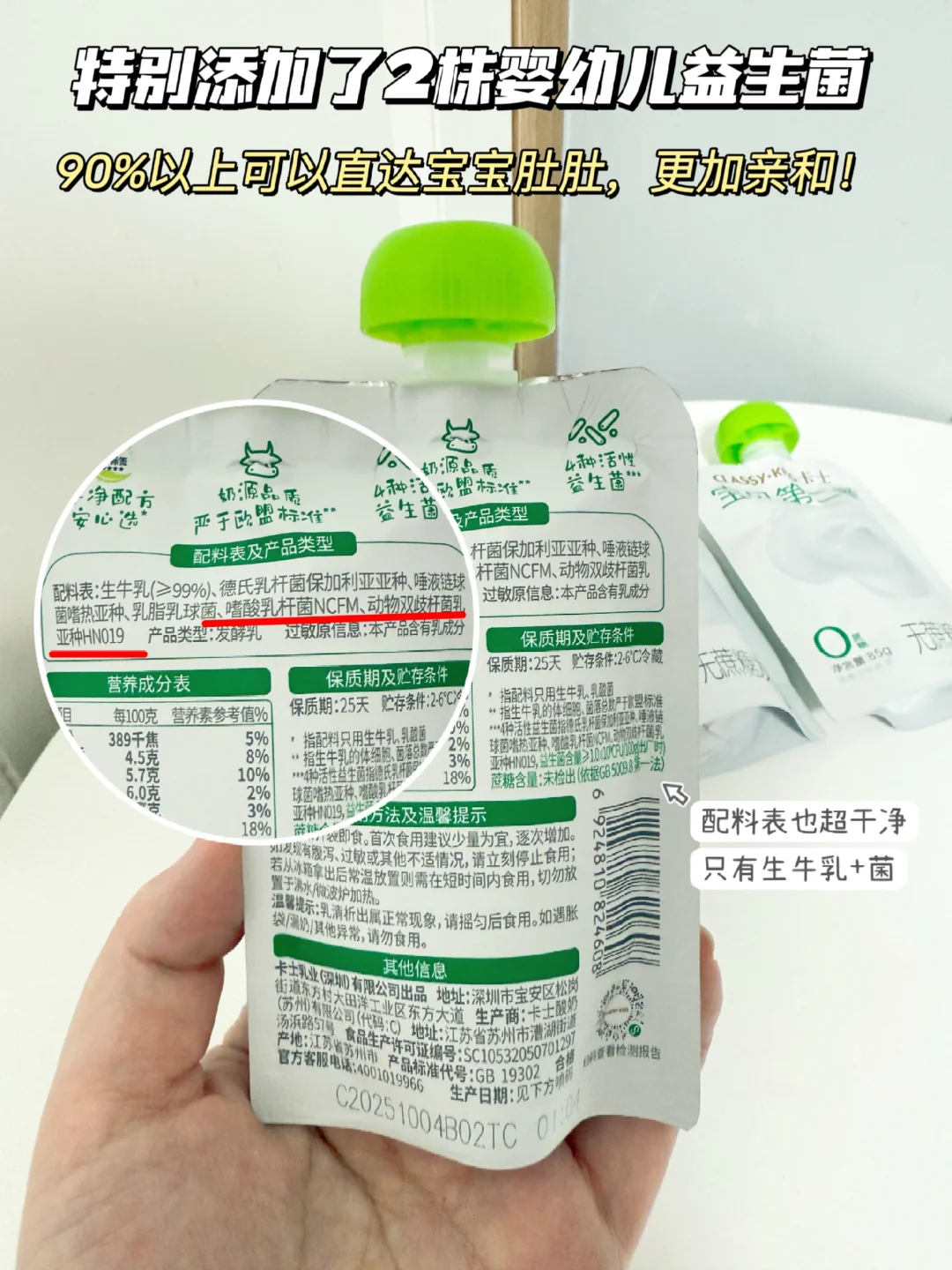 [氛围感R]结合上面的挑选要点,多翻对比后,我给宝宝选择的是卡士宝贝第二餐酸奶,它的配料表干净,[种草R]只有生牛乳和菌种,值得一提的是,除了基础的保加利亚乳杆菌和嗜热链球菌外,还特别添加了婴幼儿级别一益生菌,嗜酸乳杆菌NCFM、动物双歧杆菌乳亚种HN019,[氛围感R]更加亲和肚肚,而且90%以上可以直达宝宝肚肚发挥作用!