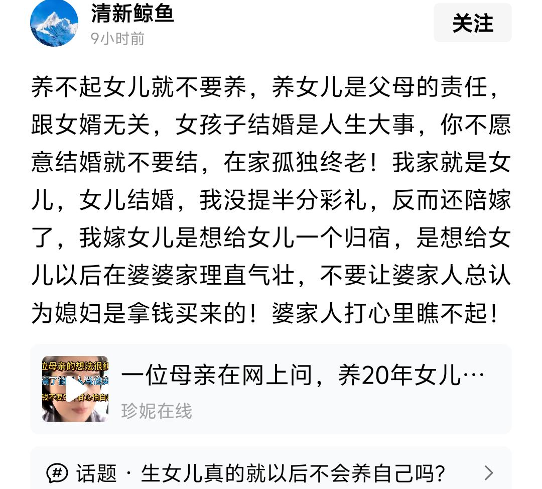 养不起女儿就不要养,养女儿是父母的责任跟女婿无关! 现在这位网友,我想问问,既然跟女婿无关,你又何必在一个与你无关的女人身上罗罗嗦嗦,纠缠不清呢? 别管人家养不养的起女儿,女儿人家都已经养大了。亭亭玉立,还上了大学找了工作。你说人家养不养得起女儿呢? 反过来说,养不起老婆就别娶媳妇儿!别把自己养老婆的责任,都推给老丈人身上。女儿人家养大了,现在,要嫁到你家!娶得起就娶娶不起就不要赖着,把机会让给娶得起媳妇的人!你老丈人,没有在嫁女儿的同时,对你家有扶贫的责任!