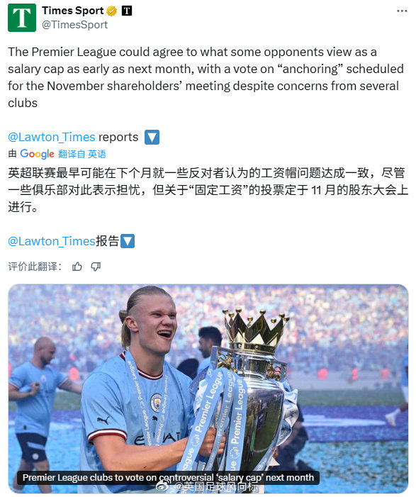 【重磅:英超工资帽制度即将投票】《泰晤士报》Matt Lawton消息:英超球队“工资帽”制度,最快将在下个月正式拍板敲定。11月21日举行的英超俱乐部股东大会,将会对这个提案进行投票。老规矩,只要超过三分之二俱乐部投赞成票(14家),提案就会获得通过,“工资帽”制度将会从下赛季开始在英超联赛实行。