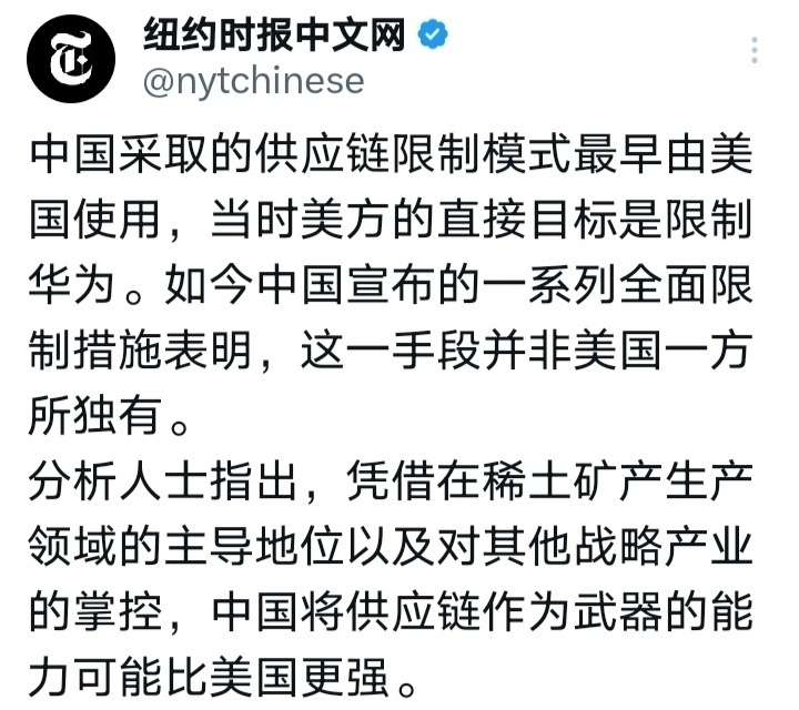 中美经贸博弈纽约时报:中国采取的供应链限制模式最早由美国使用,当时美方的直接目标是限制华为。如今中国宣布的一系列全面限制措施表明,这一手段并非美国一方所独有。