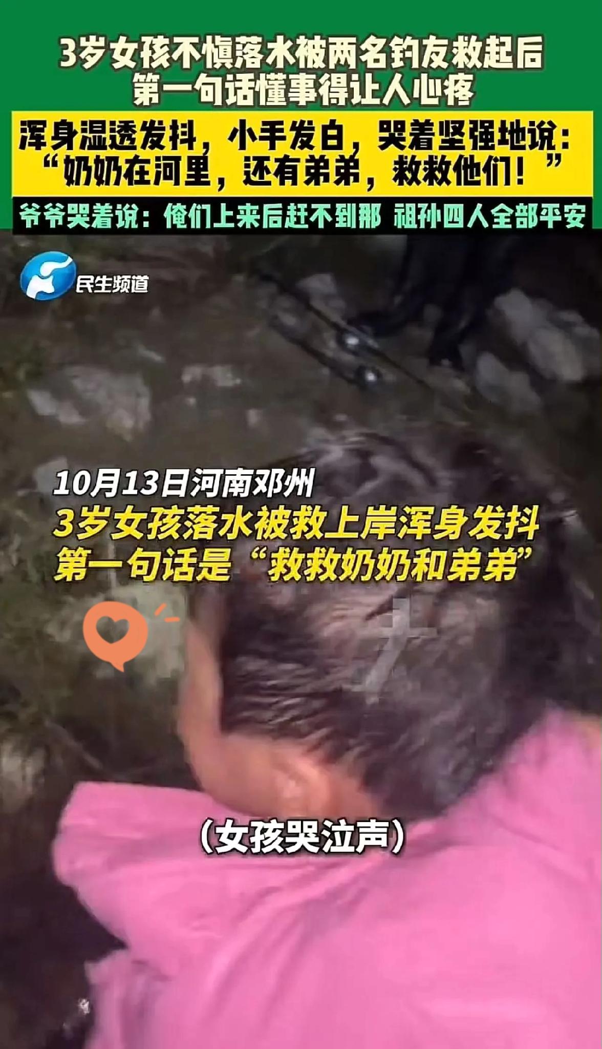 鱼竿当“救生钩”!邓州钓友黑夜上演“垂钓式”救援 10月13日晚7点40分,河南邓州一5岁女童坠河,像片小叶子似的被急流冲了三里地。 两位钓友正夜钓,忽闻河心哭救。打灯一照,女童在水里起伏。岸边陡如刀削,下水等于冒险。他俩急中生智,举路亚竿当“救命绳”。 抛钩!偏了。再抛!钩住衣角又滑了。终于,鱼钩牢牢咬住女童羽绒服。两人屏气收竿,把“水中漂”的娃拖上岸。 女童浑身湿透,张口就喊:“救我奶奶弟弟!”原来祖孙四人过桥落水,三人已自救。目前全员平安,钓友正申报见义勇为。
