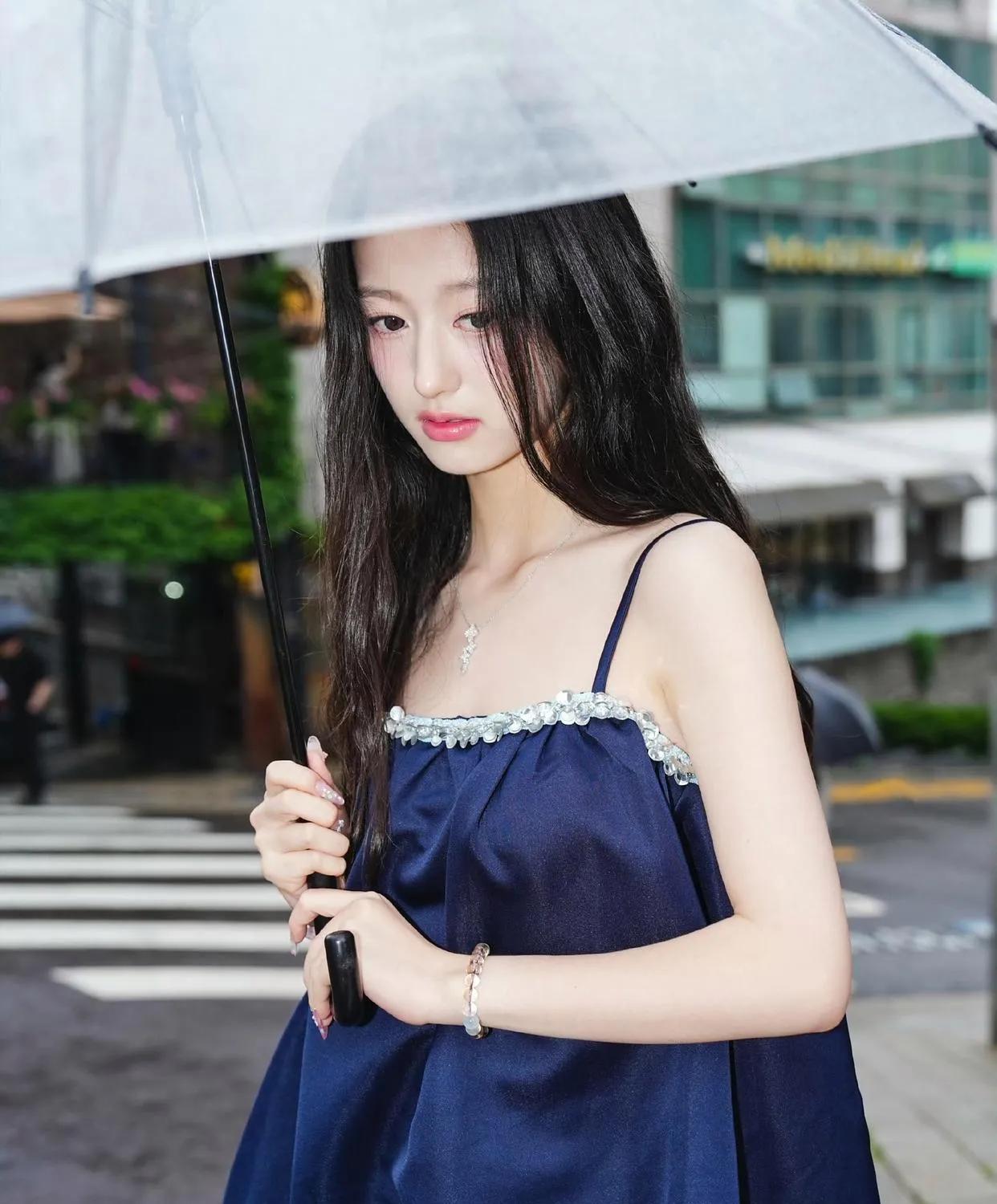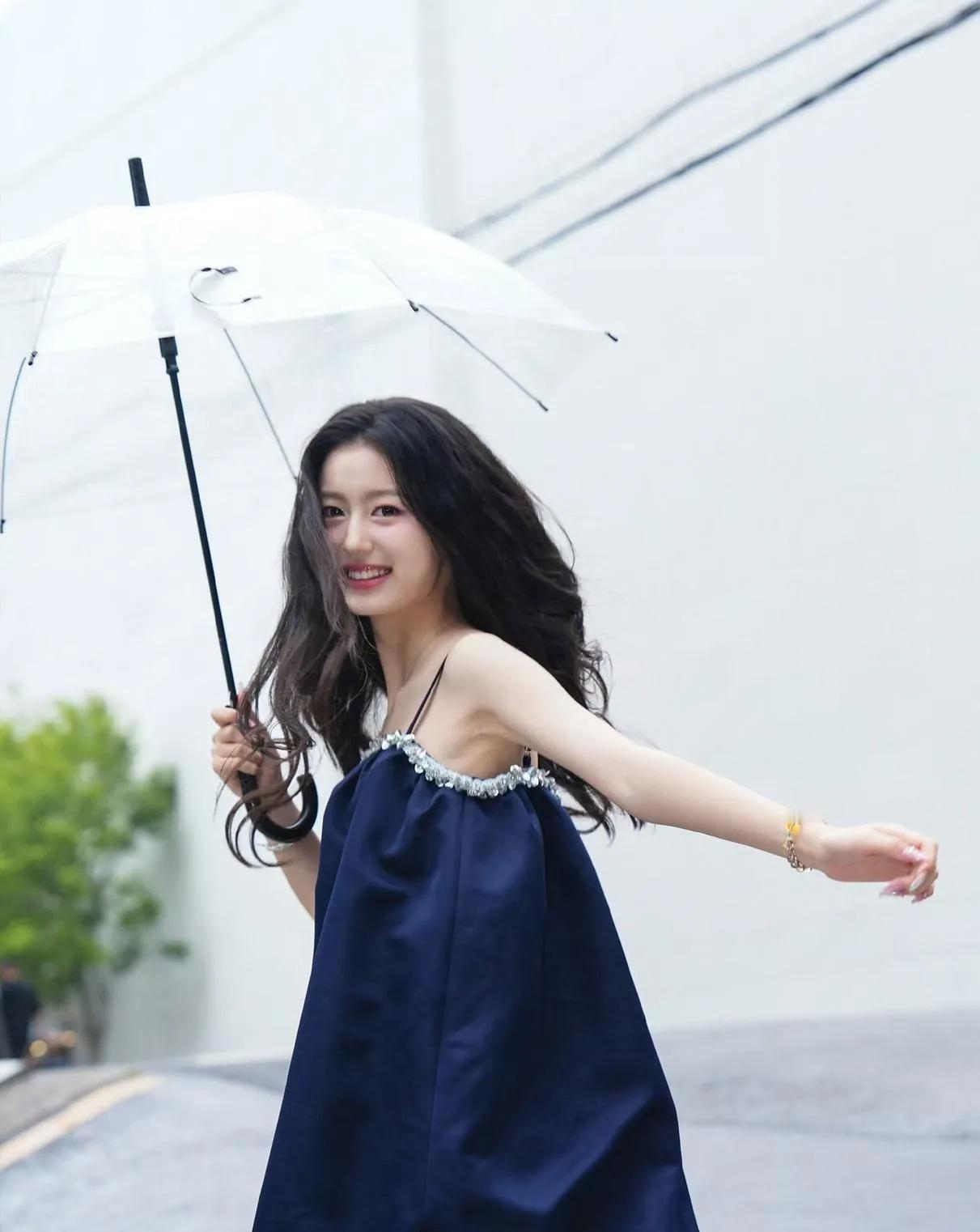 裴佳欣在雨中的这组随拍也太绝了!撑着透明伞,深蓝色吊带裙衬得她又灵又美。发丝被微