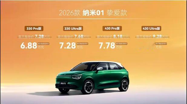 懂车之道讯懂车之道快讯,10月16日,2026款纳米01正式发布上市,共推8款车型,官方售价区间为5.98-9.28万元,限时焕新售价区间5.88-8.88万元。车身尺寸方面,其长宽高分别为4020/1810/1570mm,轴距为2663mm。智能化方面,配备5英寸液晶仪表,中控搭载12.8英寸屏幕,初心款可支持手机互联,挚爱款则配备智能语音助手等功能。高配车型将会配备50W前排手机无线充电、皮质座椅、前排座椅加热和通风等功能,另外挚爱款还新增智能限速控制功能。动力方面,全系搭载永磁同步单电机,最大功率70kW,峰值扭矩160牛·米,动力电池容量分别为31.45kWh和42.3kWh,对应续航里程分别为330km和430km。