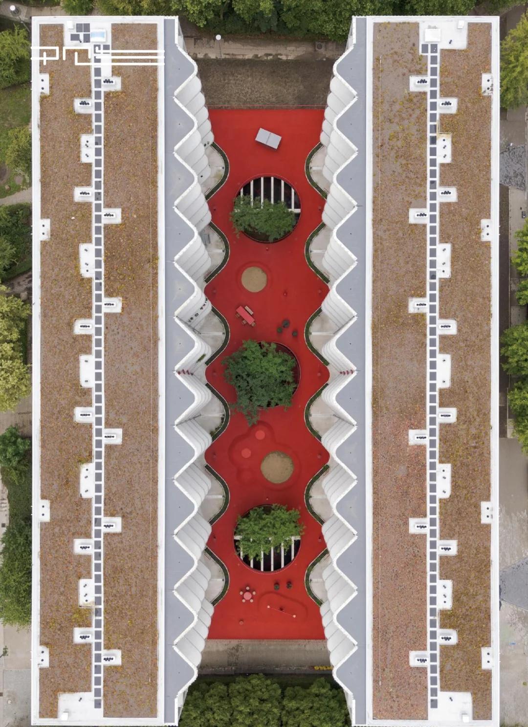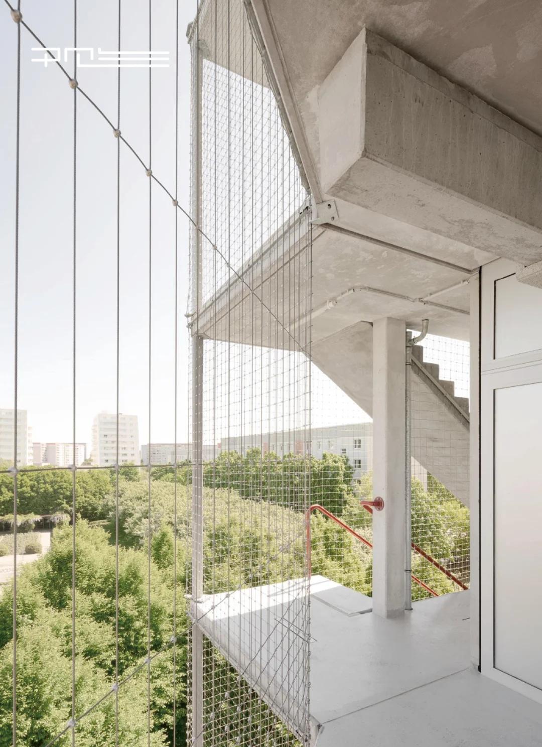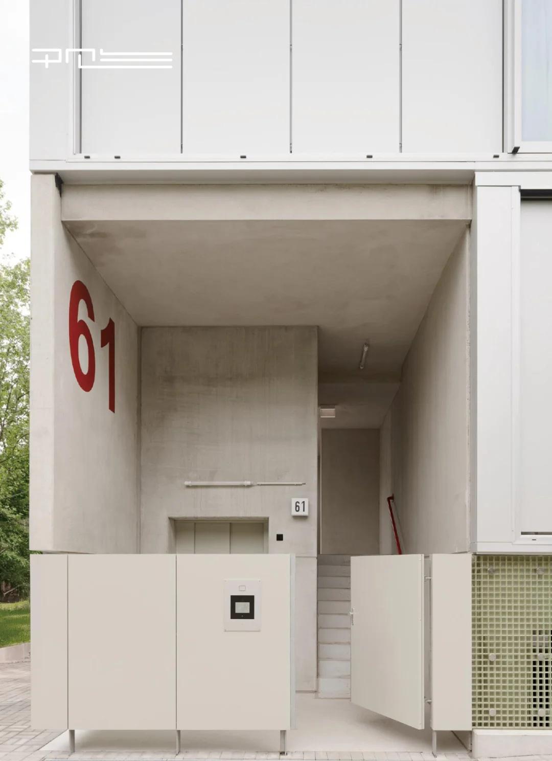 已经想到了一百种装饰家门口的方案! 💡名称:Lion-Feuchtwanger-Strasse 61 🖋设计:FAR frohn&rojas 🔍类型:住宅 📍地点:德国柏林 📅时间:2025 📸摄影:David Hiepler 该项目位于柏林Marzahn-Hellersdorf区的Kaulsdorf大型住宅区的中心,占地约3300㎡,由Euroboden开发、FAR frohn&rojas建筑事务所设计。作为连接自然景观与城市基础设施主轴线的重要节点,项目通过两栋对称住宅与中央花园平台的布局,强化了城市轴线的视觉与空间连贯性。 作为社会保障住房,本项目在延续20世纪80年代东德时期预制住宅传统的基础上,对其进行了当代化的重塑与转译。建筑以预制混凝土构件骨架系统为基础,以更灵活的空间结构,适应当代居住与工作的多样化需求。 两栋六层建筑环抱一个颜色醒目的花园平台,该平台作为社区核心公共区域,设有休闲、聚会的空间。平台下方为通透的交通层,配备运动设施、自行车与汽车停车位、电动汽车充电站与快递站,形成立体的社区生活体系。项目整体包含124套出租公寓和59个地下停车位。 进入高层公寓的开放式外楼梯面向中央花园平台,凭借单根梁向外挑出的平台在每户公寓前方营造出波浪形户外休憩区,可俯瞰楼下花园平台,精致的不锈钢网格既作护栏,亦为植物攀爬提供了绝佳的生长支架;两栋楼面向外部街区时的立面则呈现更为封闭的形态,法式阳台搭配落地滑动窗与网格状封闭式铝板。 所有公寓均可通向楼体两端,既可通往花园平台,亦可通向邻近街区。开放通透的户型设计让住户能够自主决定将私密生活区朝向外部街区还是内部花园平台。 观点views 观点好作分享 建筑 建筑美学 住宅 保障性住房
