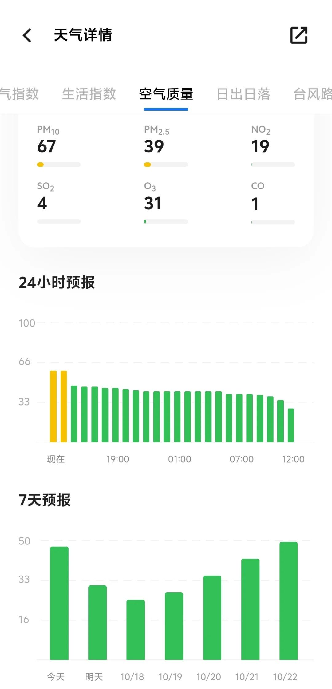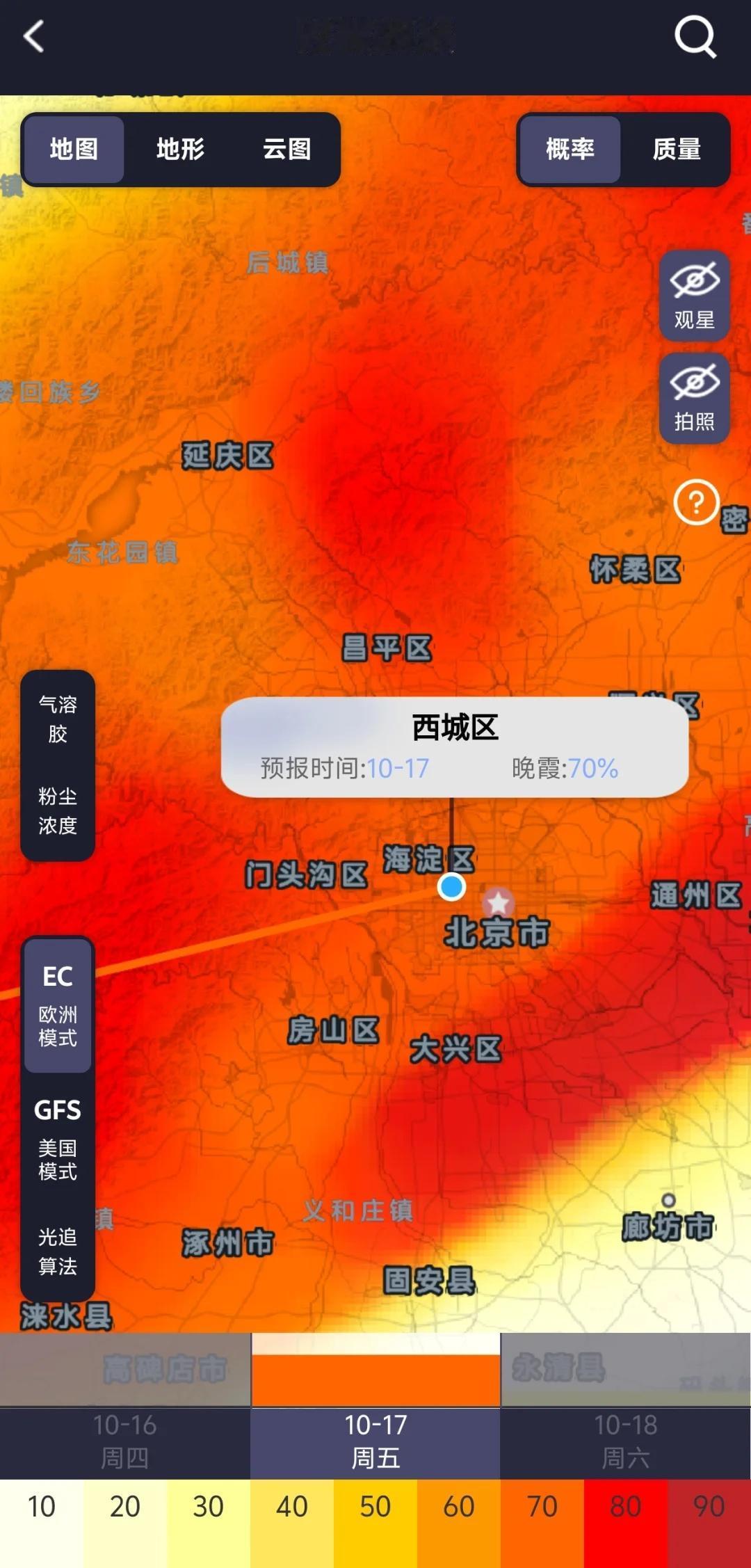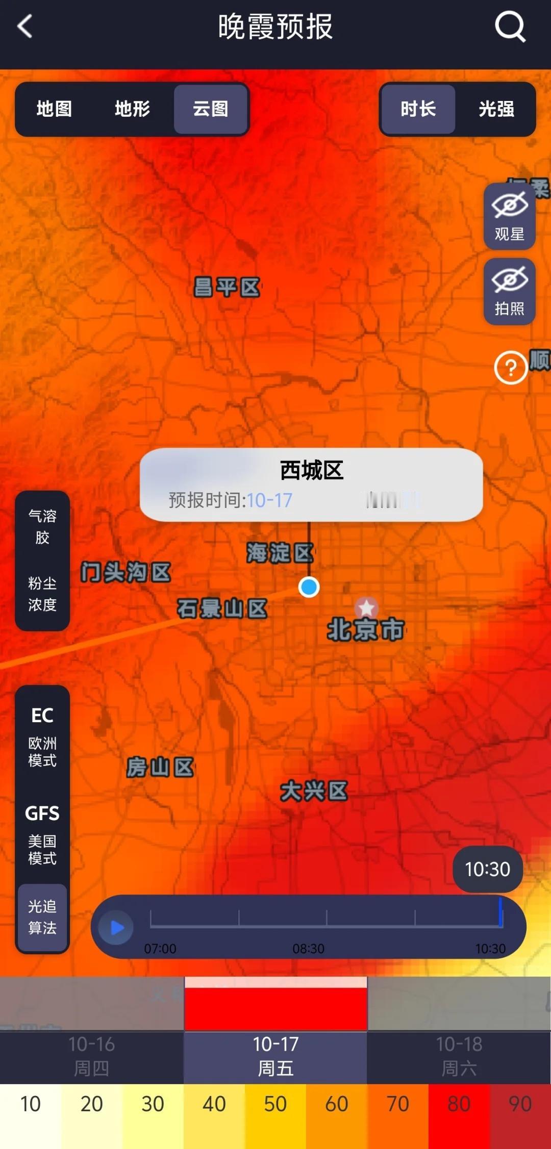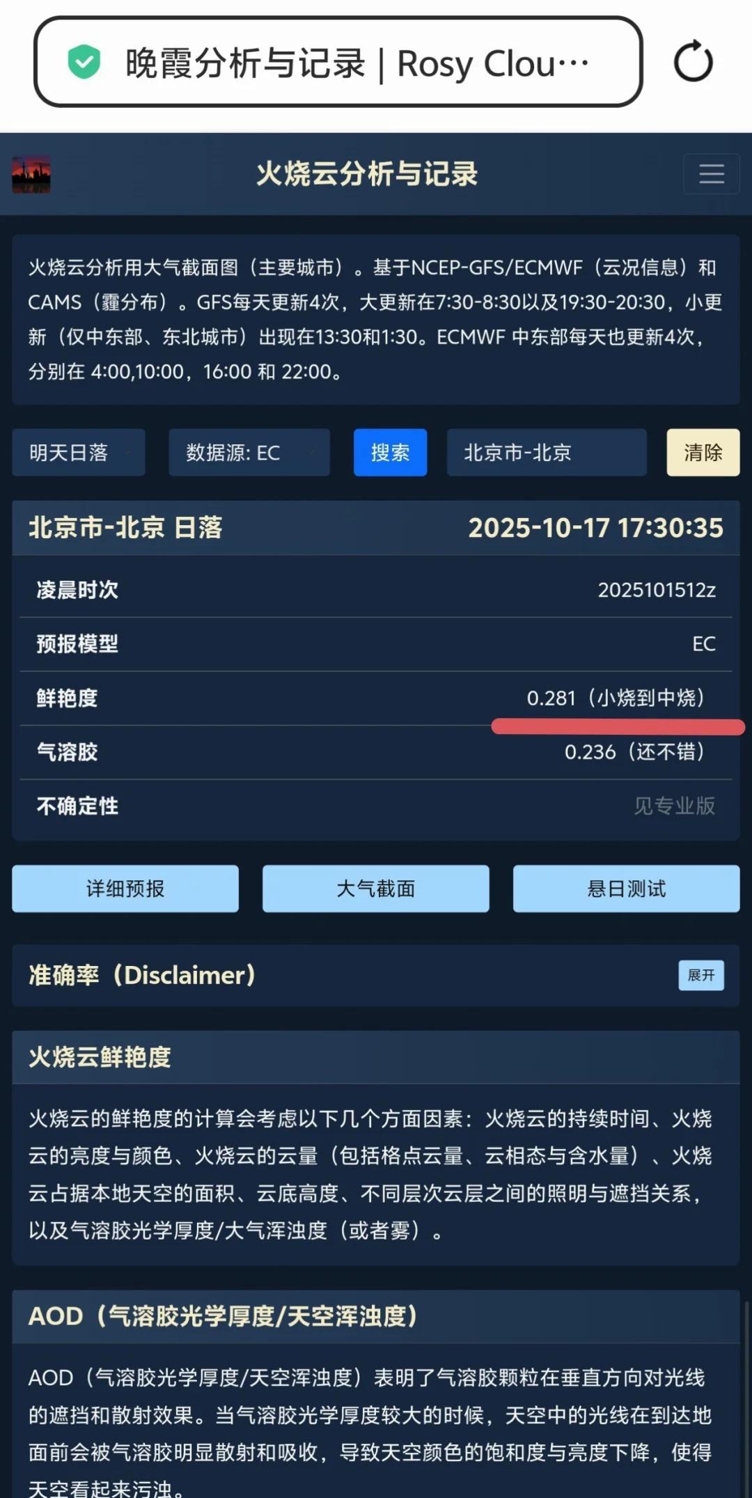 北京10.17晚霞预报·小到中烧级火烧云 火烧云分析与记录晚霞预报平台更新了明天的晚霞预报,确认了明天的确有值得一看的晚霞,火烧云鲜艳度指数达到小到中烧级(图2),气溶胶指数低,空气能见度高,各种条件有利,是个看晚霞和拍晚霞的好天气。 经历连绵阴雨天之后,北京也终将迎来秋高气爽的深秋,持续一周空气质量为优的天气(图4)。 预测 北京晚霞机位 晚霞收集者 追晚霞的人 一起看晚霞 晚霞渐变挑战 北京晚霞