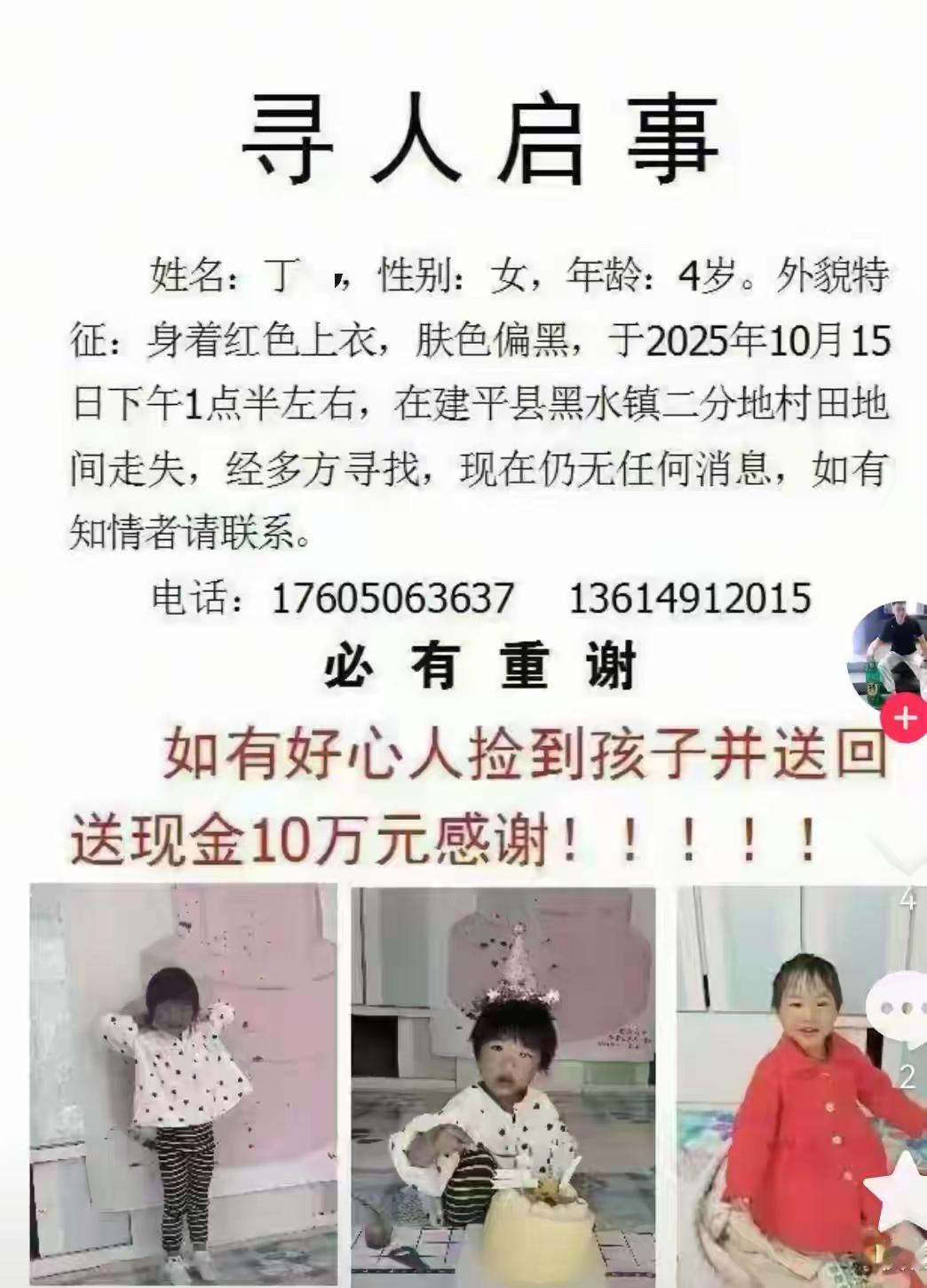 3岁女童从地头面包车内失踪,爷爷讲述孩子失踪经过;当地约上千人连夜冒雨 辽宁朝阳建平3岁女童失踪,家人悬赏10万寻人启事!10月15日下午1时30分许,辽宁省朝阳市建平县黑水镇大营子村一名3岁女童在自家面包车内玩耍时失踪。 16日下午,女孩的家属向记者表示,至今已经超过24小时的搜救行动,参与的人已经过千,并且动用了警犬、无人机等设备,但仍未找到女孩的踪迹。为了尽快找到女童,家属也发布了寻人启事,悬赏10万元找人!据女童爷爷介绍,当时他在家里看电视,女孩的父母在邻居家里打牌,女孩在车里熟睡。突然发现女孩不见了,赶紧到处寻找,发现车门是开着的, 可能被人抱走了。女孩的家属说,这里地形复杂,有大断崖,村民不敢下去搜寻。随后赶到的专业搜救队员也表示,搜寻范围逐步扩大到大断崖以下的区域,但由于雨水较大,气温也比较低,搜救队员的衣服都湿透了。尽管如此,他们还是全力以赴展开搜寻!