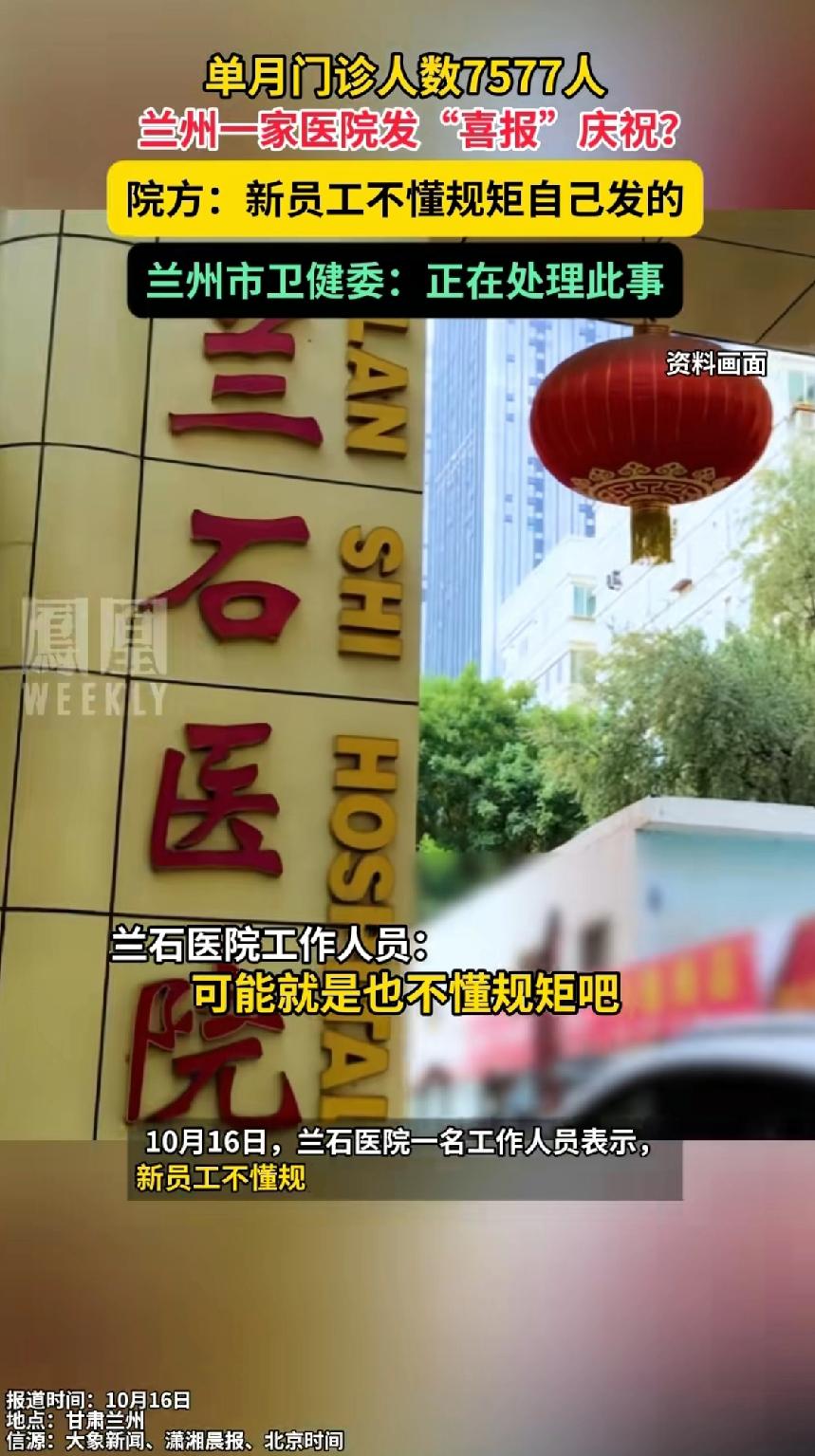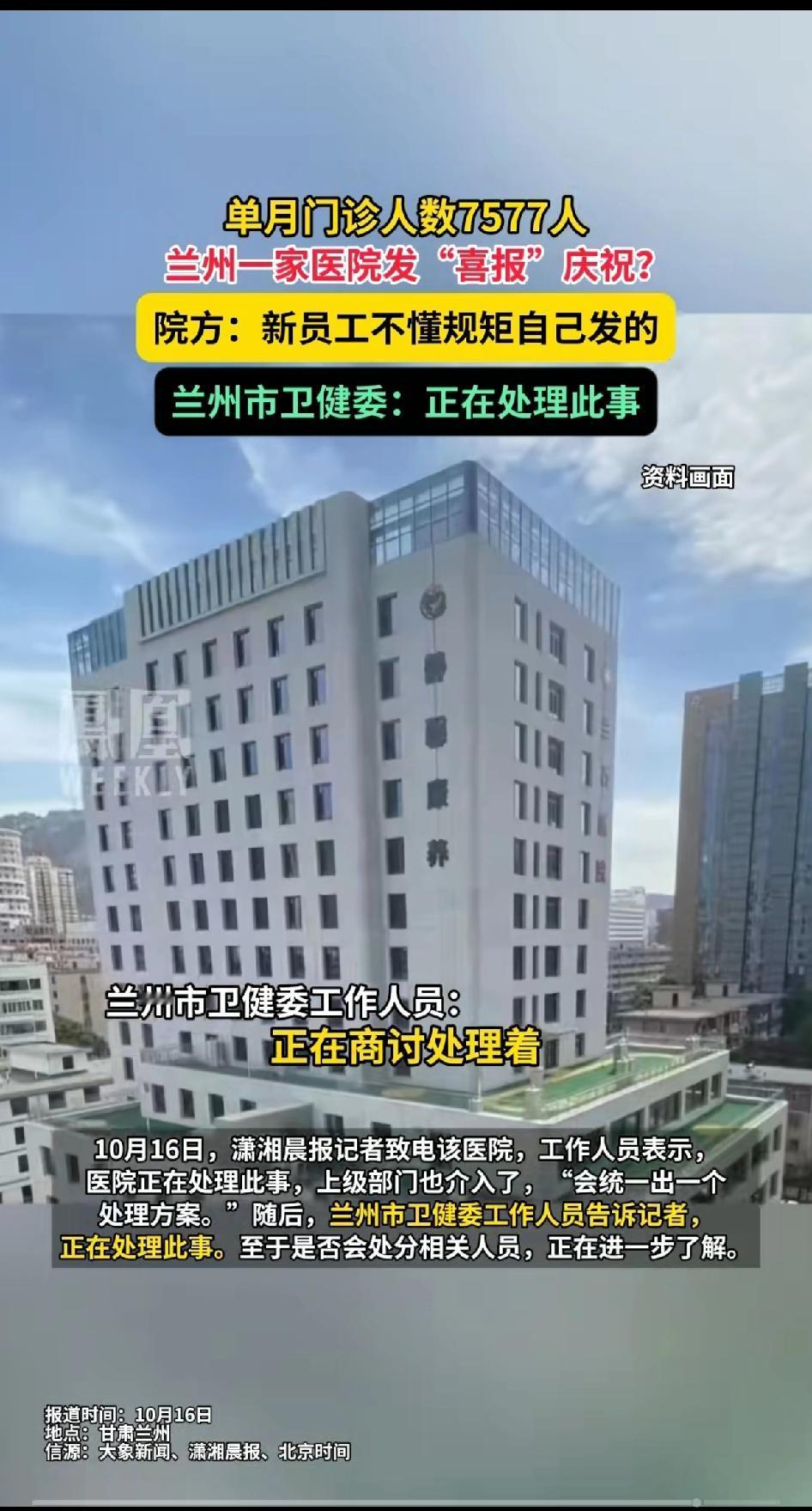 单月门诊人数7577人,兰州一家医院发“喜报”庆祝?兰州兰石医院的业绩表! 看来下半年业绩有望超额完成,医院各部门人员等着发奖金了! 网传“喜报”显示 9 月门诊 7577 人、手术 426 台,10 月开诊首日门诊 451 人、手术 25 台。 当然医院接下来的常规操作,也是大家能猜到的!就是“实习人员”操作 院方表示:是新员工自己操作的 一句话就想摘的干干净净。 可医院本是救死扶伤之地,用“喜报”庆祝就诊人数和手术量,这导向真有问题。 业绩报做的不错,大红色的“喜报”,“热烈庆祝”用的也恰当,本来就是用鲜血染红的。 这才是一群吃人血馒头地方! 早就忘了自责所在!有关部门也该好好整顿了! 最后被发现了,“只能用新员工,实习生”来搪塞! 原来,是 10 月 10 日医院会议通报工作量,数据发群里后,新员工做成“喜报”发朋友圈。医院也承认用词不当,还反思了思想教育和规范管理的疏漏。 而且这医院之前还涉及多起医疗纠纷,这次“喜报”事件更得好好整改了。