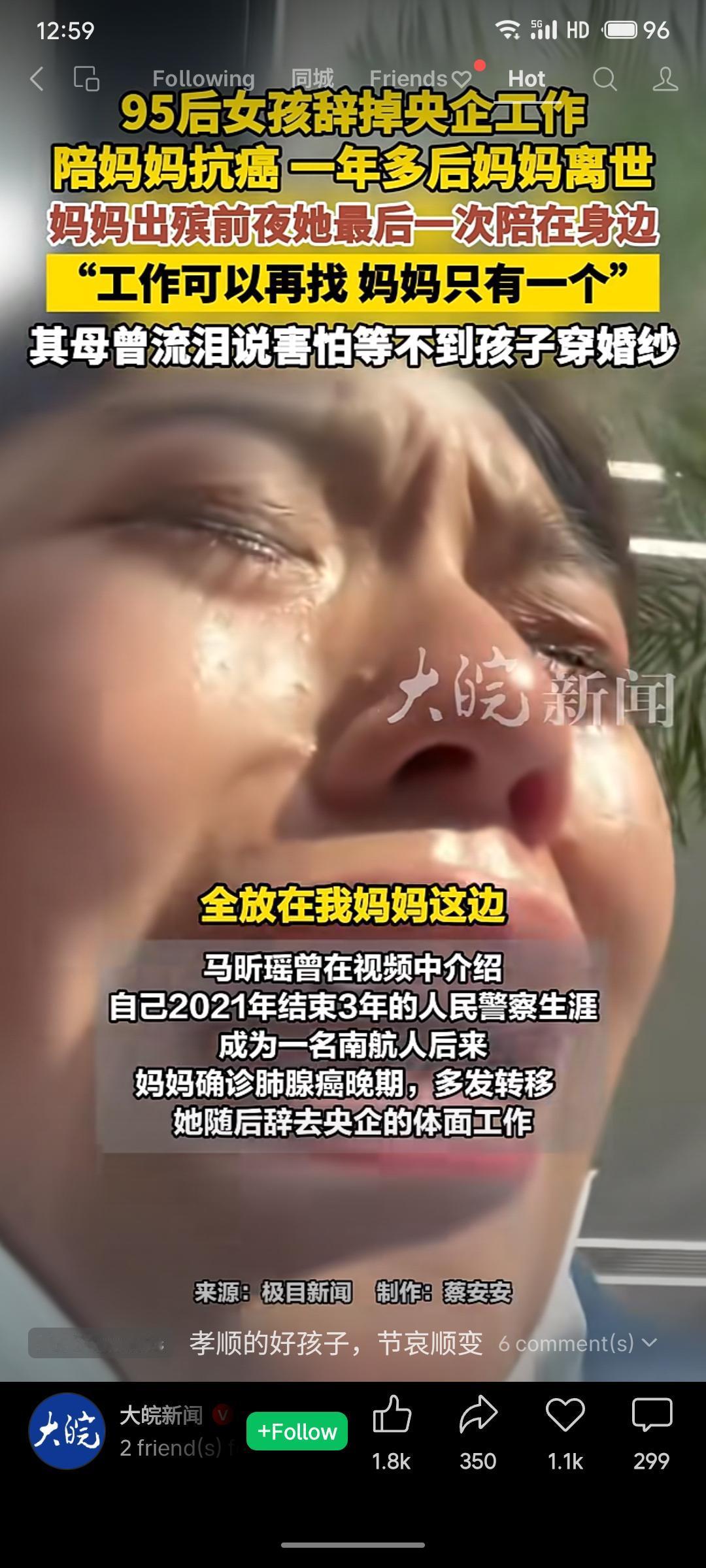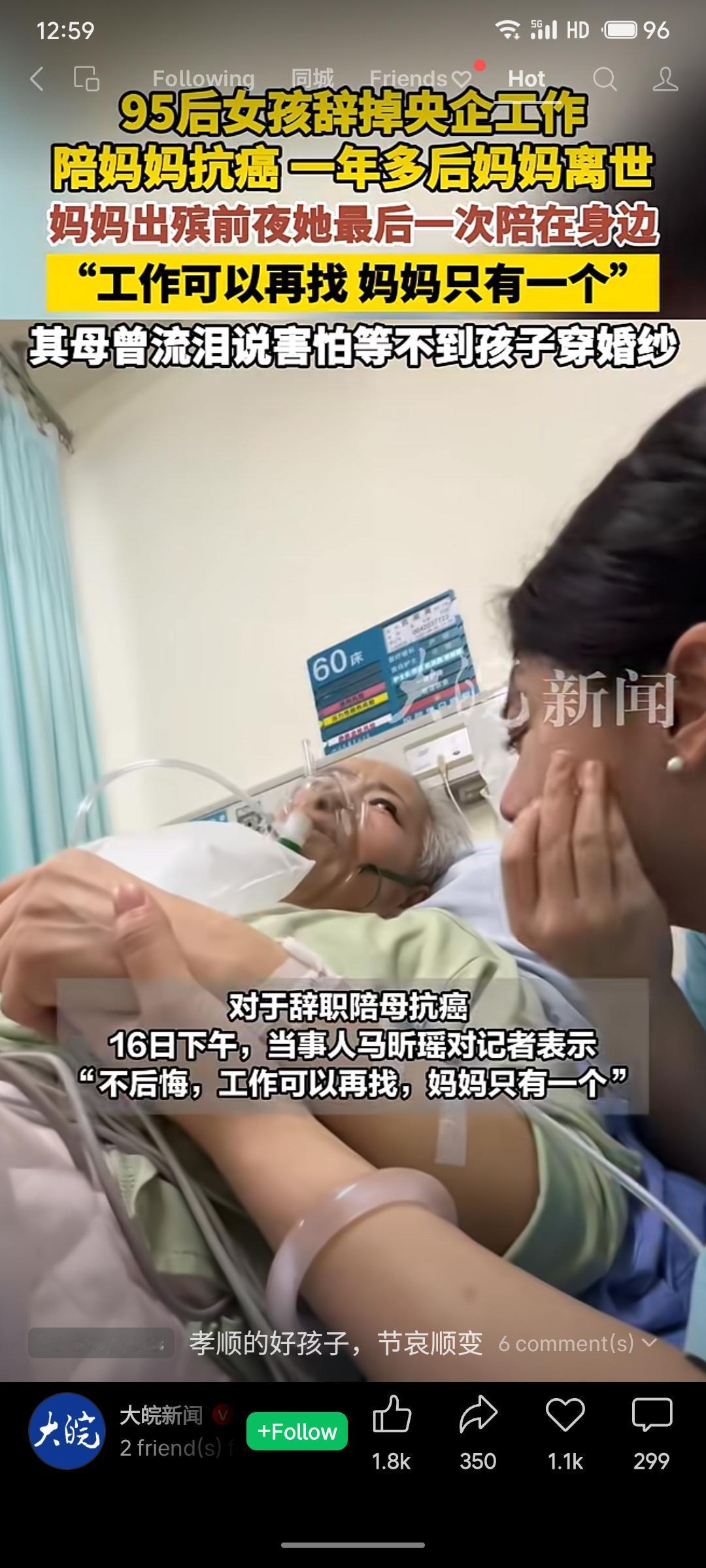 一名95后女孩马昕瑶为陪伴罹患肺腺癌晚期的母亲,毅然辞去央企工作。她表示“工作可