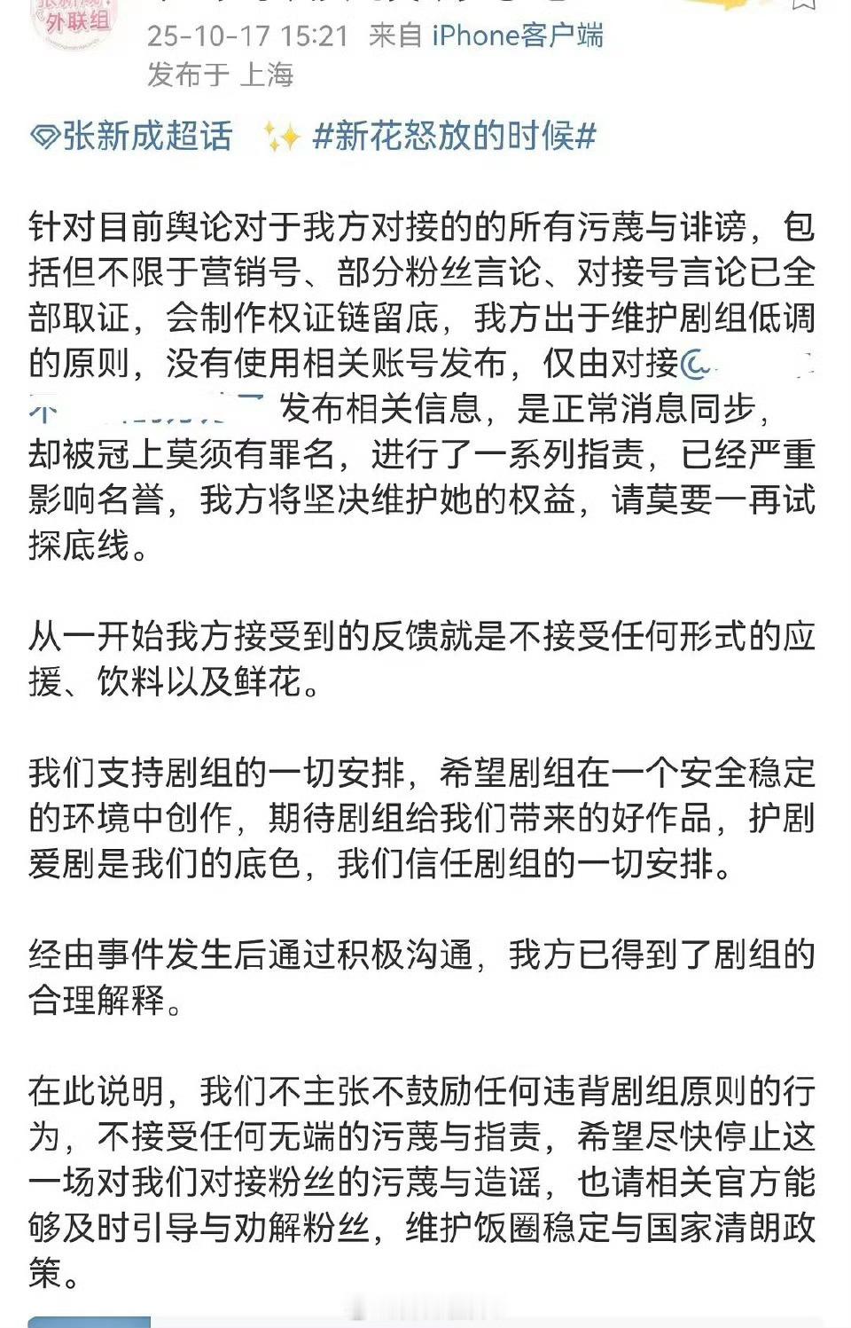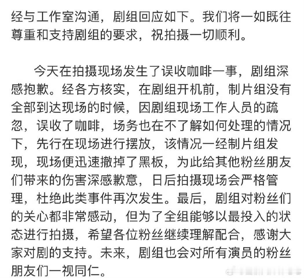 张新成粉丝冒充剧组发声道歉,被陈晓粉丝官方对接回应取证了,张新成的粉丝这操作也是很迷惑了,粉丝的几杯咖啡也不是什么正式的应援,只是让剧组的人员接过去了,居然还要团队下场,这波剧组打工人最倒霉,喝杯咖啡而已被追着骂[黑线]