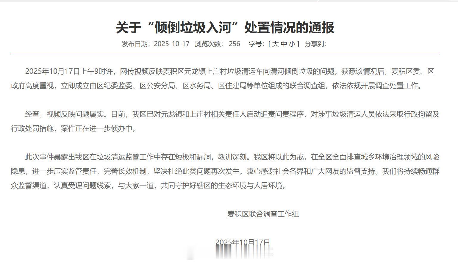 晚间,麦积区人民政府发布通报称:经查,视频反映问题属实。目前,我区已对元龙镇和上崖村相关责任人启动追责问责程序,对涉事垃圾清运人员依法采取行政拘留及行政处罚措施,案件正在进一步侦办中。