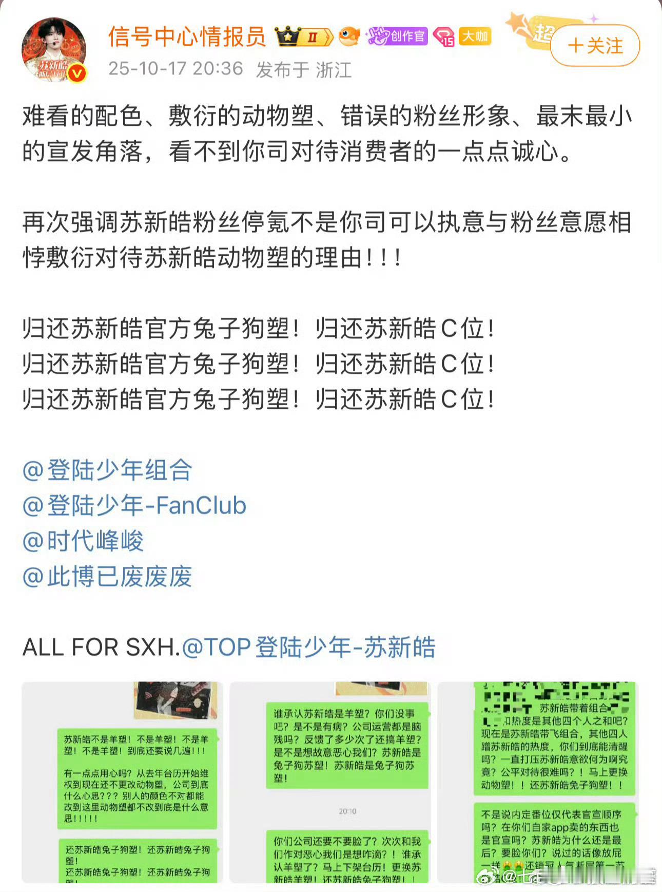 苏新皓和张泽禹两家粉丝都在维权,张泽禹粉丝要求确定团内唯一“狗塑”定位,苏新皓粉丝要求归还苏新皓兔子狗塑[思考][思考]