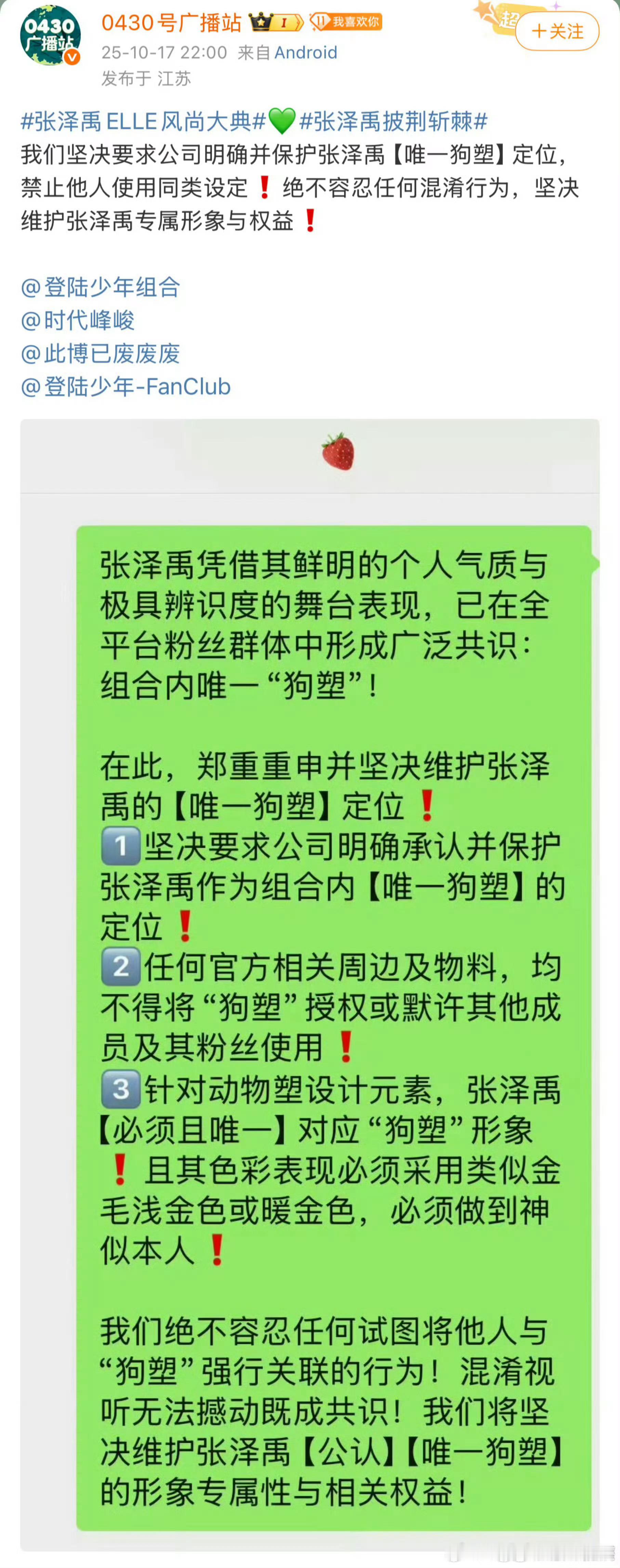 苏新皓和张泽禹两家粉丝都在维权,张泽禹粉丝要求确定团内唯一“狗塑”定位,苏新皓粉