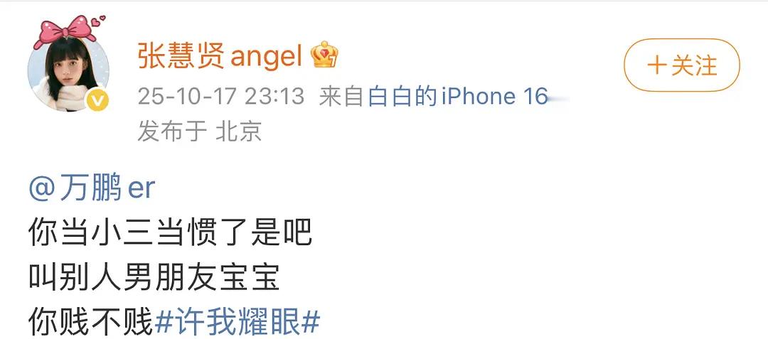 张慧贤喊话万鹏 大半夜又有新🍉了,张慧贤发文爆万鹏当小三又秒删,这些爆瓜的能不能一开始就把证据摆出来,没头没尾来这样来一句遭殃的只会是女方😅甚至还带了许我耀眼tag,真是逮着许我耀眼薅啊…… 张慧贤 万鹏当小三当惯了是吧