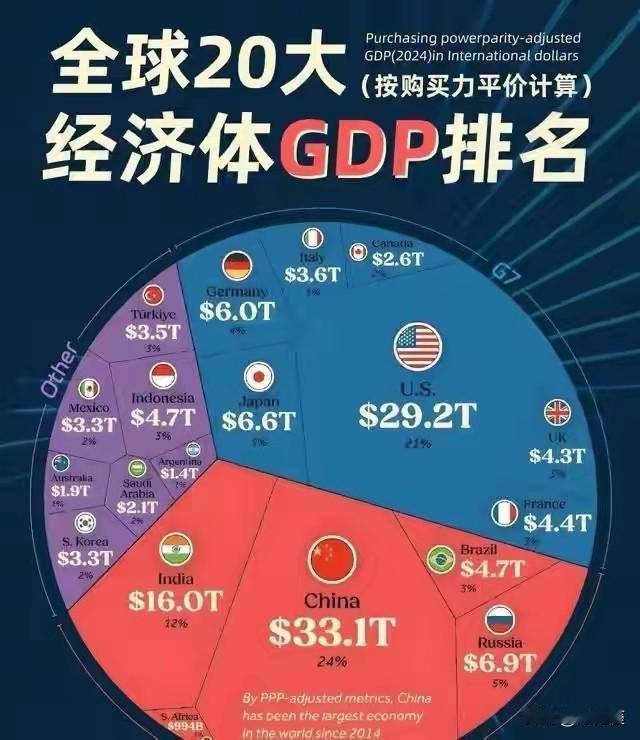 关于中美经济,目前最大的疑问是,中国经济总量是否已经超越了美国??? 如果按照常规的国际通行的GDP统计方法,美国目前的GDP是28万亿美元左右,中国是18万亿美元左右。 但是如果是世界银行基于购买力平价指数的统计数据,美国的GDP29万亿美元左右,而中国的GDP高达33万亿美元,中国比美国还要多4万亿美元。 所以,中国经济是否已经超过美国,完全是看基于哪种统计方法了。