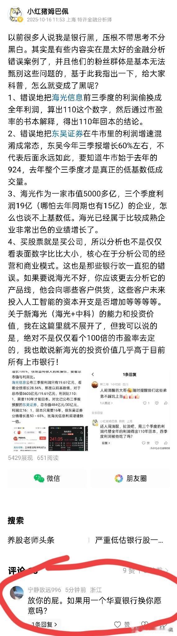 有肠胃不太好的朋友问候我,说拿一个华夏银行跟我换海光信息,我愿意不愿意? 我还以为拿什么金山银山跟我换呢,拿一家市值1,000亿的银行,换5000多亿的科技龙头,愿意换的人应该是对生活失去了信心吧……更别提这家市值1,000亿的银行经营困难,危机重重,早已经是全行业内知名的股份制商业银行中垫底生了。