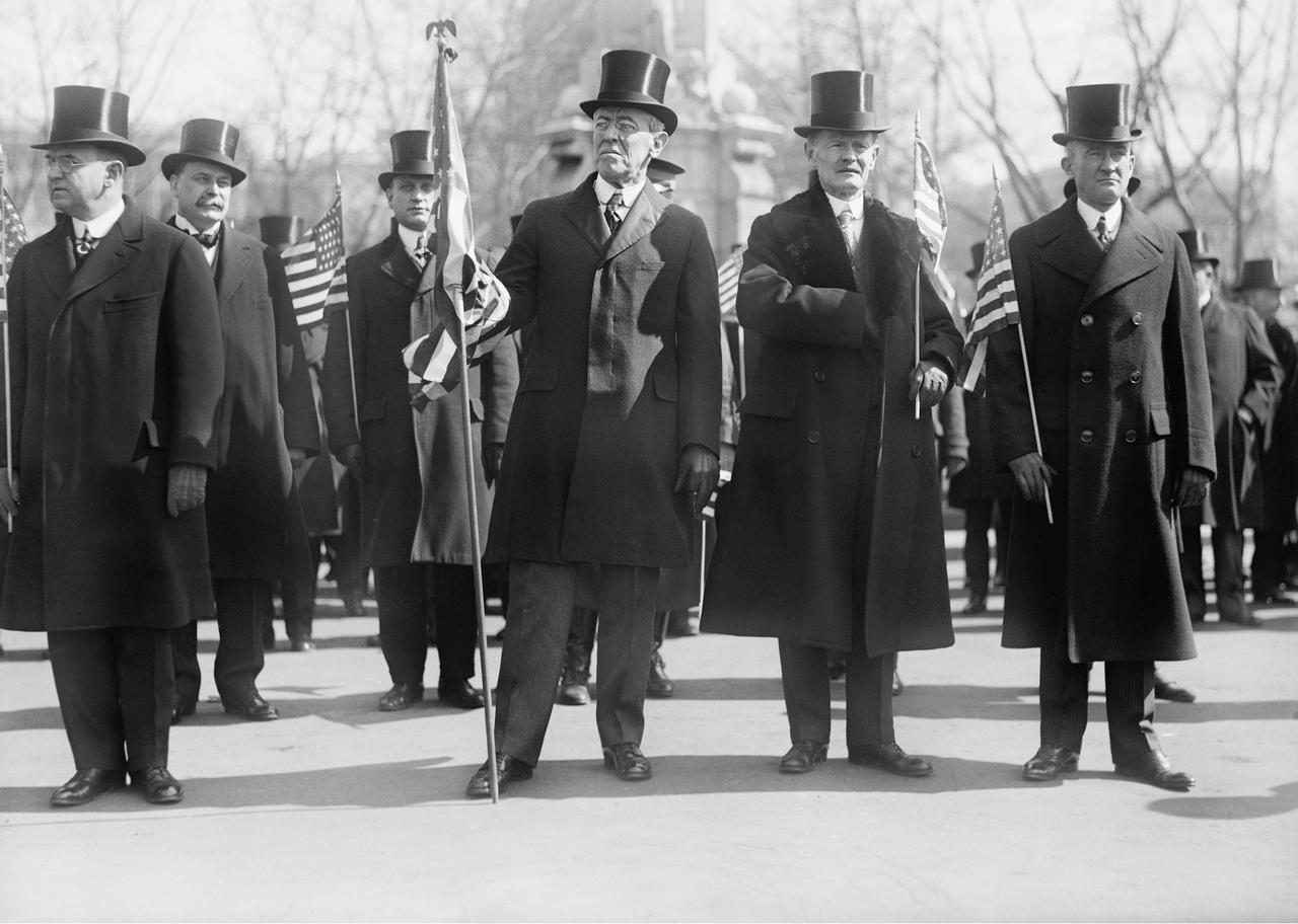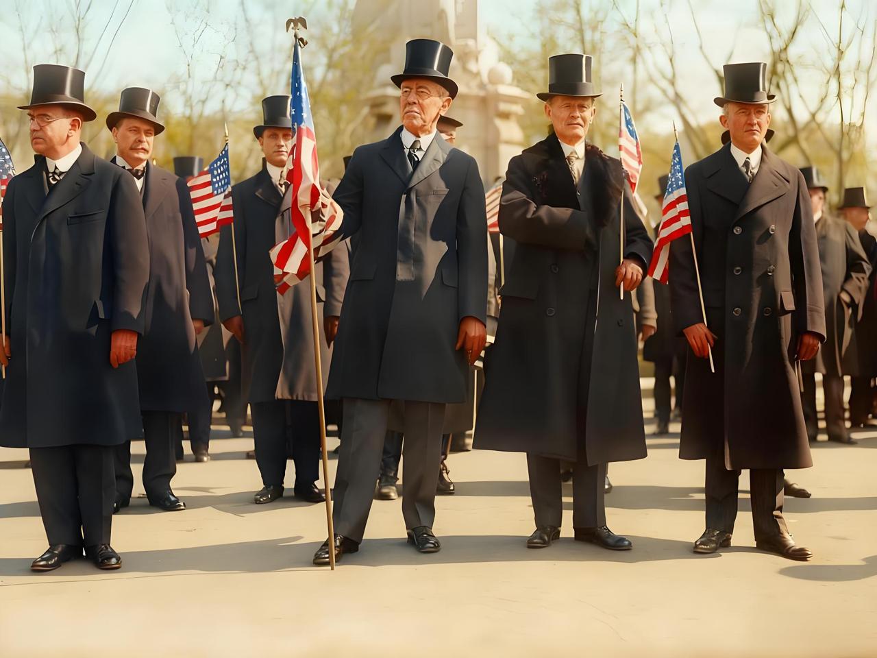 这张照片定格了1919年伍德罗·威尔逊总统从巴黎和会归国后,在华盛顿接受民众热烈欢迎,画面中,威尔逊总统居于中央,身着黑色长款大衣,头戴高顶礼帽,手持美国国旗,神情庄重;其左侧的副总统托马斯·马歇尔同样以黑色大衣、高顶礼帽的正式装扮亮相,周围人群也多着同款风格的黑色长外套与礼帽,手持星条旗。