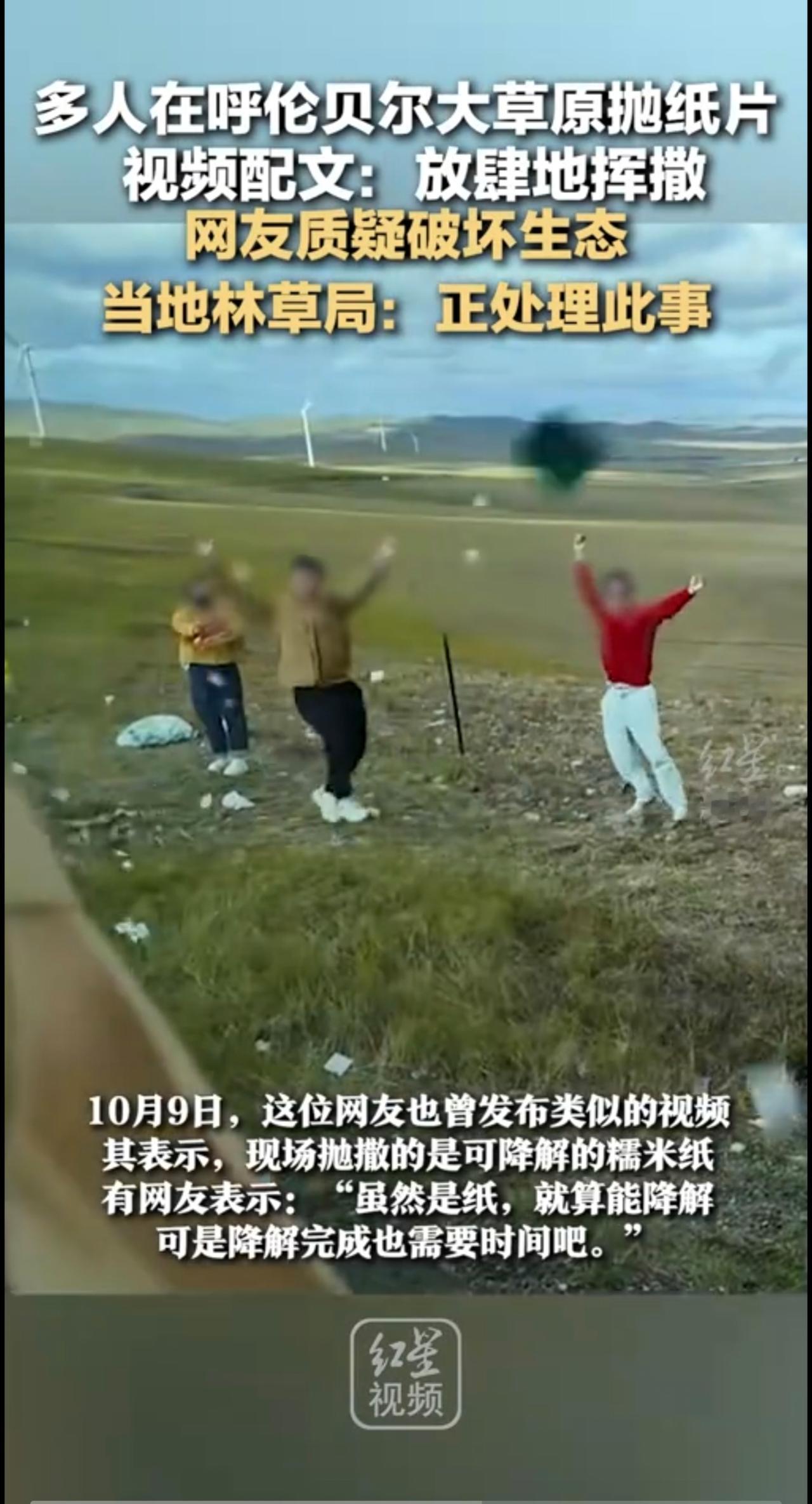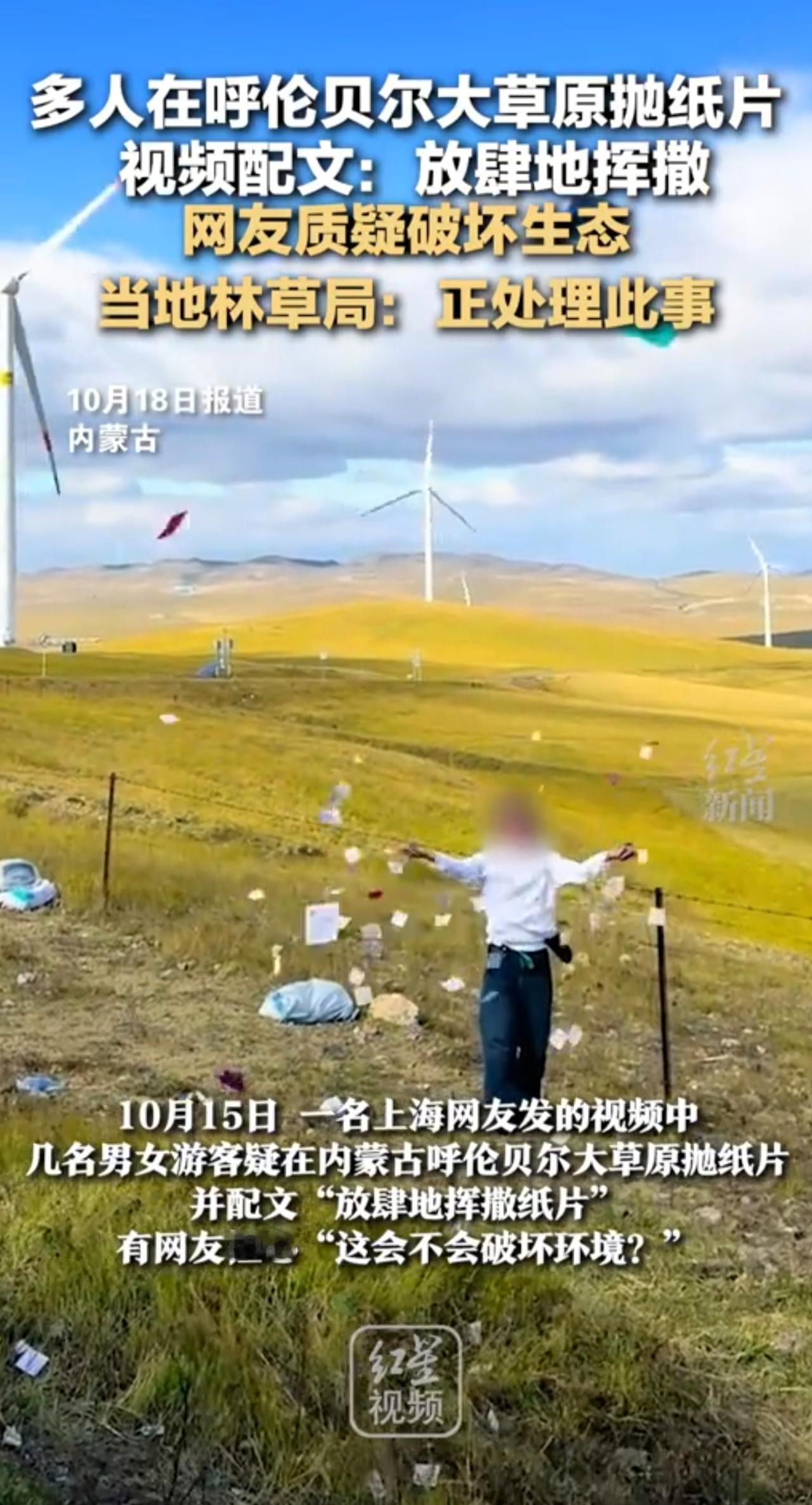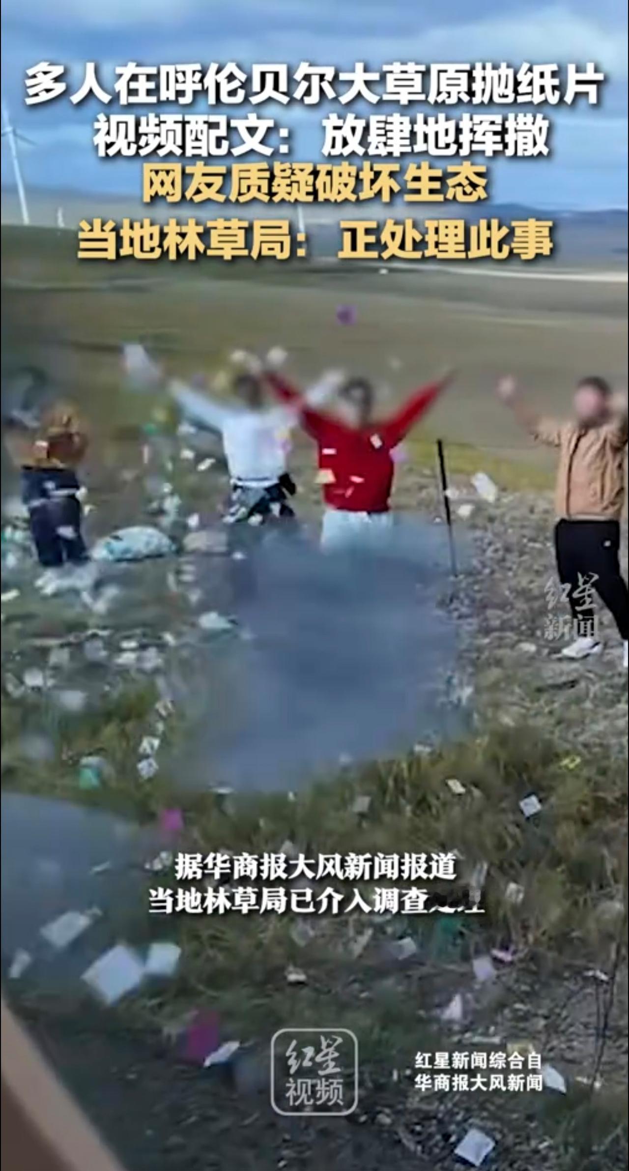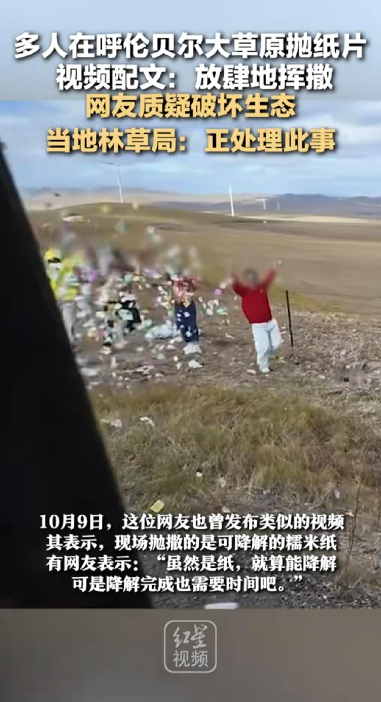 多人在呼伦贝尔大草原抛纸片 视频配文:放肆地挥撒 网友质疑破坏生态,当地林草局:正处理此事 更多资讯关注@红星新闻