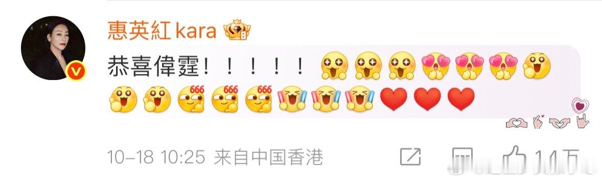 惠英红恭喜陈伟霆得子惠英红恭喜陈伟霆当爸爸 惠英红给陈伟霆送生子祝福,满屏的 emoji 加恭喜,红姐这操作好有梗,感觉她是真为陈伟霆高兴,这种真诚的互动在娱乐圈还挺难得的。