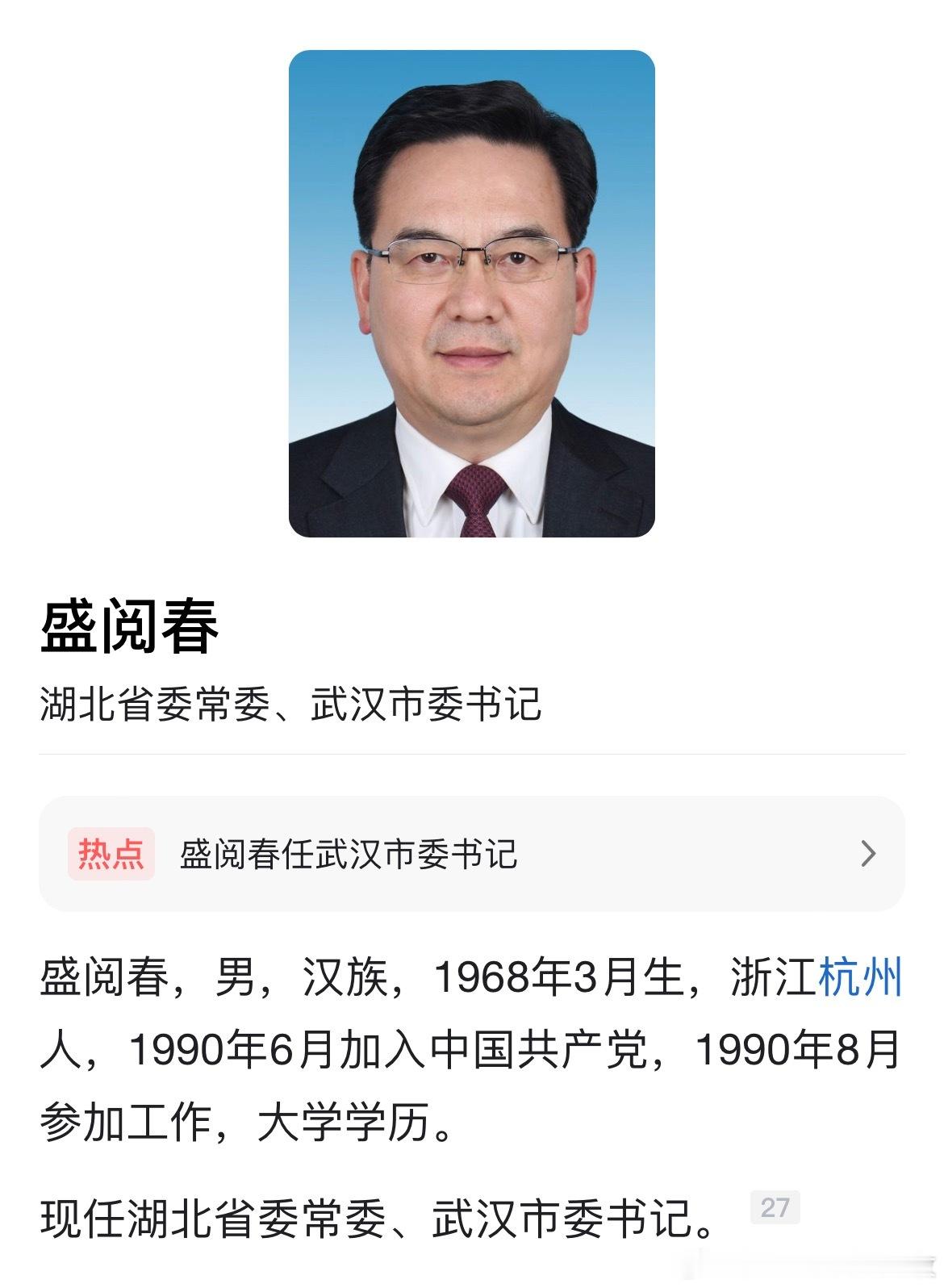 盛阅春任湖北省委常委、武汉市委书记。热点现场