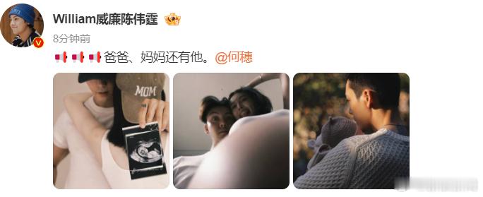 2025年10月18日,陈伟霆何穗晒照官宣得子:“爸爸、妈妈还有他。” (新浪娱乐)