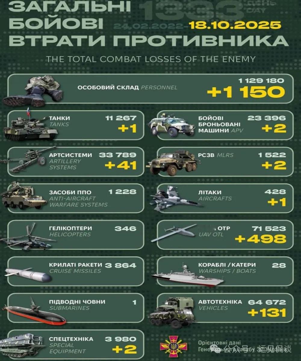 【2025年10月18日乌克兰战报】乌方每天发布而且有累计数,具有连贯性,至少可以看合订本。也欢迎大家转发俄罗斯官方发布带有累计数的每日战报。