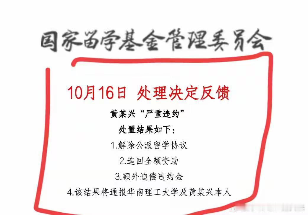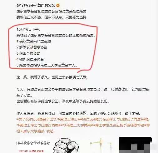 大家都知道前段时间网络上68页PPT爆料妻子在英国纽卡斯尔大学留学时与华南理工大学的公派博士生黄某同居偷情的事吧,作为出轨女方的丈夫张先生一直在维权。 这件事从曝光那天起,就在网上吵得沸沸扬扬,有人同情张先生的遭遇,也有人觉得家丑不可外扬,不该闹到公开层面。但不管外界怎么议论,张先生始终没松过劲,一门心思走正规途径维权,这份坚持其实挺不容易的。毕竟换作普通人,遇到这种又伤心又费精力的事,说不定早就打退堂鼓了。 事情的进展确实不算快,没有像网上某些热点事件那样几天就出结果。但慢归慢,每一步都走得扎实。最开始大家都在等校方的态度,毕竟黄某 是华南理工大学的公派博士生,学校对学生的行为规范按理说该有明确约束。可等了好一阵子,校方那边始终没给出公开答复,这让不少关注此事的人都有些着急,甚至有人猜测是不是事情太复杂,校方还在内部协商。 好在张先生没有只盯着校方,他同时把相关的举报材料提交给了国家留学基金管理会。这一步走得很关键,因为黄某 享受的是公派留学资格,国家留学基金管理会作为资助方,对受资助者的行为有直接的监管权力。没过多久,管理会就给出了准确且坚决的回复,这份回复算是给了关注此事的人一个明确的交代。 国家留学基金管理委员会认定黄博士的行为严重违约,直接解除了与他的公派留学协议。这还不算完,后续还要追回全部的资助资金,另外还要让他支付违约金,最后通报结果也会同步给学校和黄博士最后。这个处理结果一出来,不少人都觉得解气,不是因为看别人倒霉,而是觉得这种违背规则和道德的行为,就该受到应有的惩罚。公派留学名额本来就珍贵,是国家花资源培养人才的重要途径,受资助者拿着国家的钱,却做出违背公序良俗、破坏他人婚姻的事,本身就是对资源的浪费,更是对信任的辜负。 现在管理会的处理已经落地,接下来大家的目光自然又回到了校方身上。既然负责资助的部门都已经给出了明确的处罚意见,学校作为培养单位,总该有个说法吧?黄某 作为在校博士生,他的行为不仅影响了个人声誉,也或多或少会对学校的形象造成影响。而且从规则层面来说,学校对学生的道德品行和行为规范有教育和管理的责任,面对这样已经被官方认定的违约行为,校方的处理态度和方式,其实也是对其他学生的一种引导——到底是纵容失德行为,还是坚守规则底线。 再说说张先生,这段时间他把大部分精力都放在了维权上,关于妻子出轨的后续细节,他没有对外透露太多。这种做法其实挺理智的,先集中精力追究破坏婚姻、违背规则的第三方,把该走的程序走完,至于和妻子之间的问题,或许等这些事情尘埃落定后,他才会有精力去处理。毕竟婚姻里的矛盾复杂,不是一朝一夕能解决的,先把外部的纠纷处理清楚,也能让他更冷静地面对自己的婚姻问题。 其实这件事之所以能引起这么多人的关注,不只是因为它有“出轨”“公派博士”这些吸引眼球的标签,更因为它触及了大家心中对“规则”和“道德”的共识。规则面前人人平等,不管你是什么学历、什么身份,只要违背了规则,就该承担后果;而道德虽然没有法律那样的强制约束力,但它是社会运行的基石,一个人如果连基本的道德底线都守不住,就算学历再高、能力再强,也难以成为真正对社会有用的人。 黄博士的例子就是个警示,他寒窗苦读多年,好不容易获得公派留学的机会,本该珍惜机会努力深造,可却因为一时的糊涂,做出了违背道德和规则的事,最终不仅失去了珍贵的留学资格,还背上了违约的污点,未来的人生道路也可能因此受到影响,这实在是得不偿失。 现在就看校方接下来会怎么处理了,不知道校方会不会根据管理会的通报结果,进一步对黄某 做出相应的处分。而这件事也让我们思考,在培养人才的过程中,到底是该只看重学历和成绩,还是该同样重视品德和规则意识?如果只注重学术能力,忽略了道德教育,会不会培养出更多“有才无德”的人? 各位读者你们怎么看?欢迎在评论区讨论。