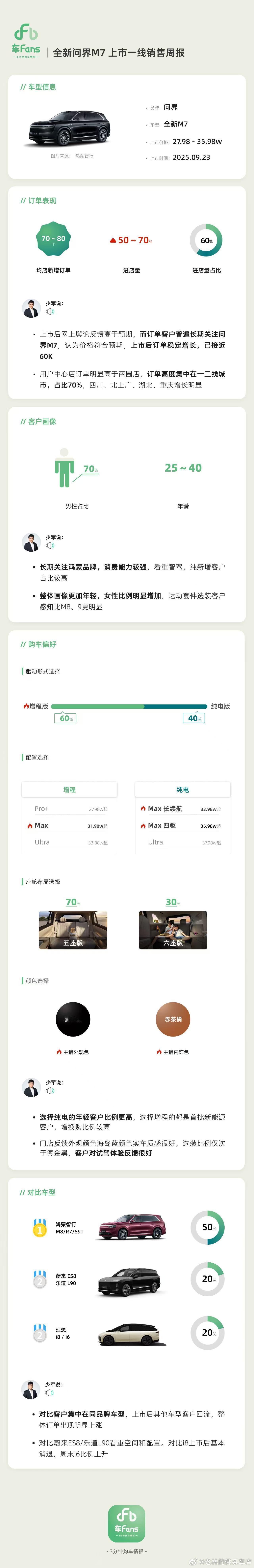 全新问界M7交付破万交付破万。30万级别SUV六边形战士产能还是最大限制。还好只发布了四驱。要后驱出来又得发钱了[doge][doge]大v聊车