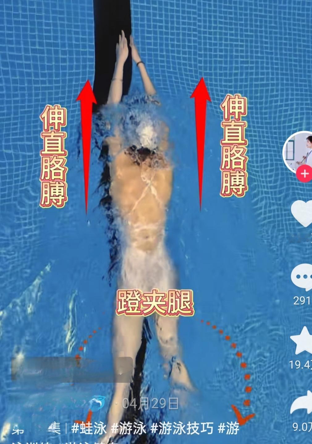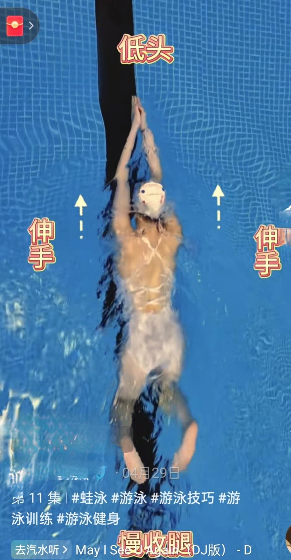蛙泳口诀:抬头划手腿不动,伸手低头慢收腿,伸直胳膊蹬夹腿,手脚并拢飘一会儿 。抬头划手吸气,伸手低头慢吐气,收翻蹬夹飘一会。 总之,先划手,腿不动;再伸手吐气,腿依次完成收翻蹬夹,即腿动时手不动;最后手脚并拢飘一会。不知道这样理解对是否正确,望会游泳的友友多多指教。打卡游泳