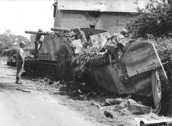 美军士兵检查丢弃在路边的德军150毫米胡蜂自行榴弹炮和Sd.Kfz. 251 Ausf. D半履带装甲车,1944年7月31日摄于法国芒什省库唐斯区的圣但尼勒加,它们可能是战斗结束后被美军推土机推出路面的。 这两辆车都隶属于2SS帝国师的2SS装甲炮兵团,编号110的自行榴弹炮战斗室侧面写着它的昵称“克劳塞维茨”。