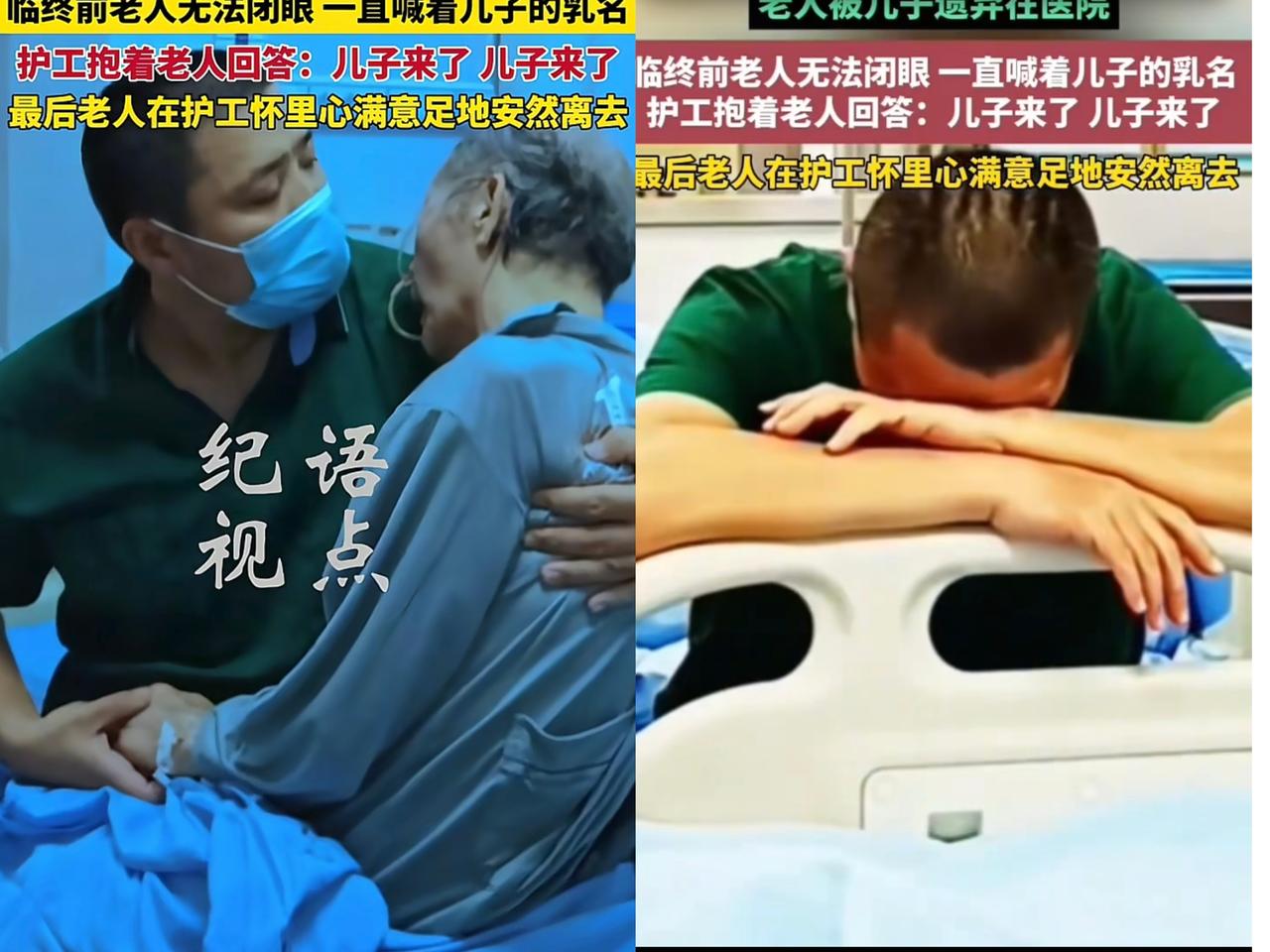 老人被儿子遗弃在医院, 临终前老人无法闭眼, 一直喊着儿子的乳名。 护工抱着老人