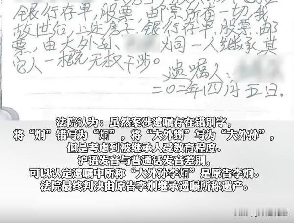 上海,一名男子一生未婚未育,生前立下遗嘱,将名下所有财产赠予给外甥,其他人均无权干涉。无奈,临走之前没有公开遗嘱,导致遗嘱落入自己的大姐跟二姐手里。幸亏在办后事的时候,外甥帮老人家整理遗物,意外发现了这份遗嘱,于是将遗嘱拿去跟自己大姨、二姨理论,但是却遭到对方拒绝。 齐鲁壹点10月17日报道了这则新闻。张大姐、张二姐看到外甥拿到遗嘱,却称遗嘱里面有字迹错误,不认可遗嘱内容,跟外甥李炯协商不成,最后只能上诉。 上海的一位张大爷,这一生未婚未育。眼看自己年事已高,他准备早早立下遗嘱,否则在自己百年之后,难免又是一场纷争。 于是张大爷提笔写下了一份遗嘱,在遗嘱里面,张大爷写清楚:自己名下所有的财产,都留给自己的外甥李炯。包括一套房产、银行存款、股票、邮票等等所有的理财,均归李炯一人,其他人都无权干涉。 立完遗嘱之后,张大爷并没有将遗嘱公开,也没有交到外甥手里,而是随手放置到大衣柜里。后来没多久,张大爷就离开了人世。 在张大爷离开人世之后,因为张大爷没有儿女,只有两位至亲大姐、二姐尚在。根据法律判定,将张大爷的遗产、合理判定给了张大姐、张二姐。 分得遗产之后的两位大姐,内心也是非常愉悦,毕竟她们认为这些所得都是合理合法所得。后来,给张大爷办大事这天,张大爷的外甥在给舅舅整理遗物的时候,却意外发现了之前的那份遗嘱。 外甥李炯看到遗嘱的时候,上面有部分错别字,大外孙、李炯的炯字多了一横,但是还是可以清晰的了解到老人家的意愿,他准备将自己的遗产全部留给自己。 李炯就把这份遗嘱给拍了下来,并且发给了自己的大姨跟二姨。当时大姨看到了这份遗嘱,态度非常坚决,声称这份遗嘱无效。 为什么大姨会认为无效呢?一来是张大爷将外甥,写成了外孙;二来将“李炯”写成“李烔”,这些错误表明,这份遗嘱缺乏真实有效性。 不过,在审理过程中,相关部门却表示:第一,虽然张大爷写错了错别字,将“炯”错写为“烔”,将“大外甥”写为“大外孙”,但是一切都情有可原,毕竟张大爷的受教育程度、沪语发音问题导致了差别。 第二,经过查实,张大爷也没有其他的子女、所以也就没有外孙,根据实际情况可查,外孙就是外甥,也没有其他亲属,所以切切实实可以知道,老人家就是想要把遗产留给自己的外孙李炯。 在发现遗嘱之后,李炯也及时将遗嘱拍摄下来立即发送给了自己的大姨跟二姨,所以张大姐、张二姐也不可以否认自己知道接受遗赠这件事。 综合判定,李炯可以合法继承张大爷的遗产,要求张大姐、张二姐立即将遗产返还给李炯。张大姐得知之后,一直不服气,准备提起上诉,但是二审之后还是维持原判。 在张大爷的遗嘱中,也明确指出,自己的遗产只能留给自己的外甥,其他人一概不能干涉,可见张大爷有此意愿,最终也终于可以落到实处,相信张大爷的心也得以安定。 1.老人家立遗嘱的时候,因为知识水平受限,有写错别字的情况,错字是否会影响遗嘱的效力呢? 根据《民法典》第1143条规定,遗嘱需要满足立遗嘱人具备完全民事行为能力、意思表达真实、内容合法。错别字本身不直接导致无效,其效力认定标准仍然合理,不会因此丧失法律效力。 类似本案,如果因为错别字产生纠纷,可以通过协调沟通来加以解决,如果立遗嘱人的文化水平、书写习惯等如此,则可以判断出老人家的真实意思。 2.有遗嘱的情况下,存在遗产继承顺位规则,是以顺位规则为主、还是以遗嘱为主呢? 根据《民法典》第1123条规定,继承开始之后,有遗嘱的按照遗嘱继承或者遗赠办理;无遗嘱或者遗嘱无效时,才适用法定继承。 本案中张大爷生前有立遗嘱,因此在其去世之后,分配遗产时,就需要尊重老人家的真实意愿,尊重老人的自主权。虽然跟法定继承顺位冲突,但是还是要以遗嘱为准。 遗嘱就是彰显老人权利的第一见证,其他驳斥均无效,尊重遗嘱就是尊重老人的意愿。最后的判决也是大快人心,相信张大爷也得以心安。 对于本案,大家是否都会有自己的看法呢,欢迎一起来讨论吧。