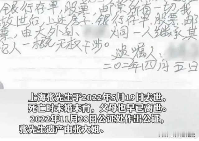 上海张先生终身未娶、无儿无女,去世后姐姐们公证平分了他的遗产。可外甥李炯整理遗物