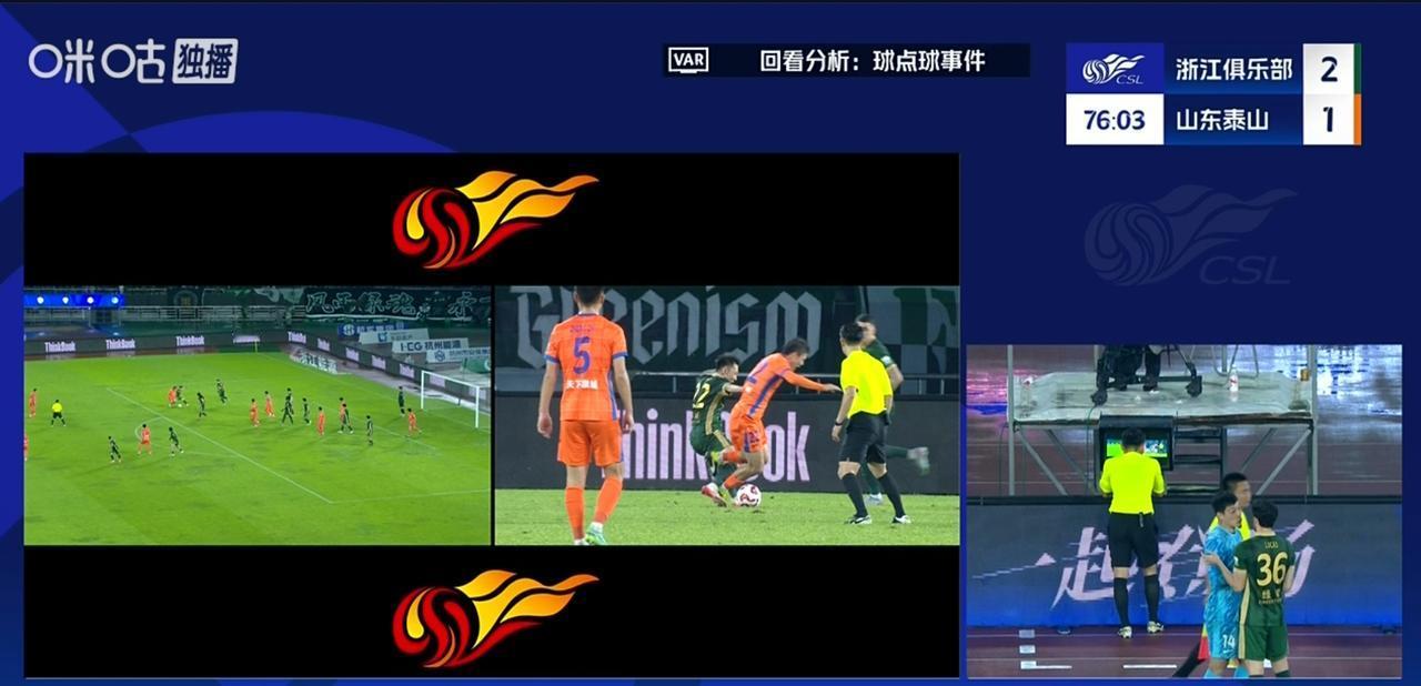 中超联赛出现离谱点球判罚争议!在山东泰山对浙江队的比赛中,泰山队外援中锋泽卡在